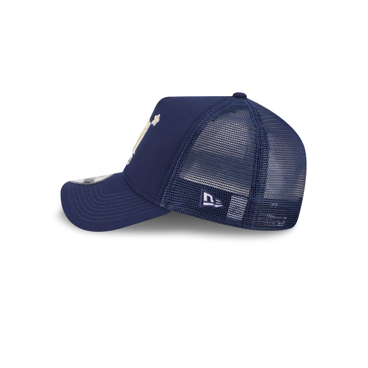 The Navy Midshipmen Go-To 9FORTY A-Frame Trucker features an embroidered Midshipman logo at the front panels with a snapback closure at a mesh rear.