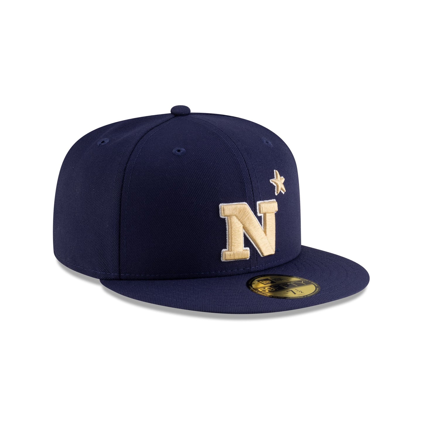 The Navy Midshipmen Midnight 59FIFTY Fitted Cap features an embroidered Midshipmen logo at the front panels with a wordmark at the rear.