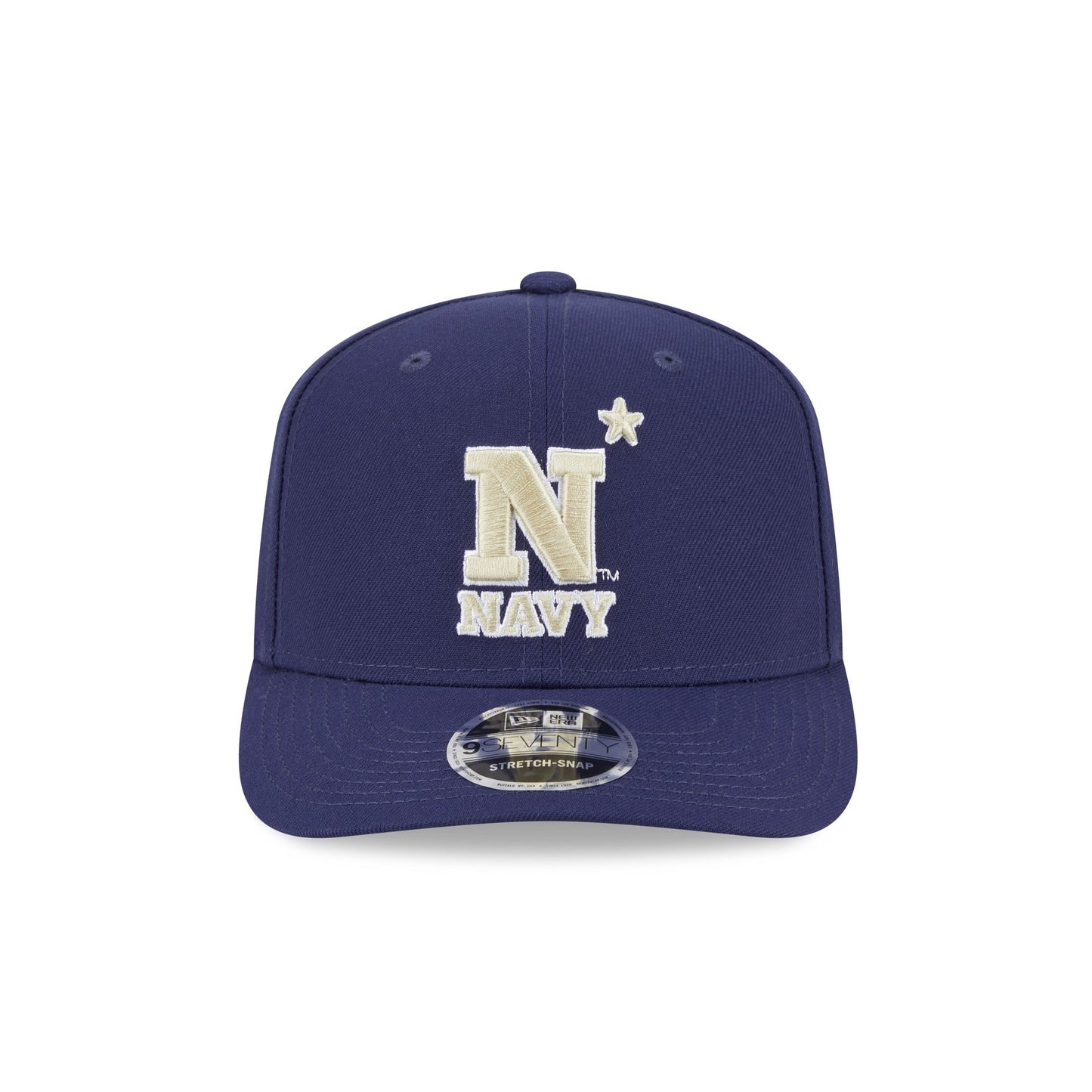 The Navy Midshipmen Team 9SEVENTY Stretch-Snap Cap features an embroidered Midshipman logo at the front panels with an alternate team logo above a snapback closure at the rear and a gray undervisor.