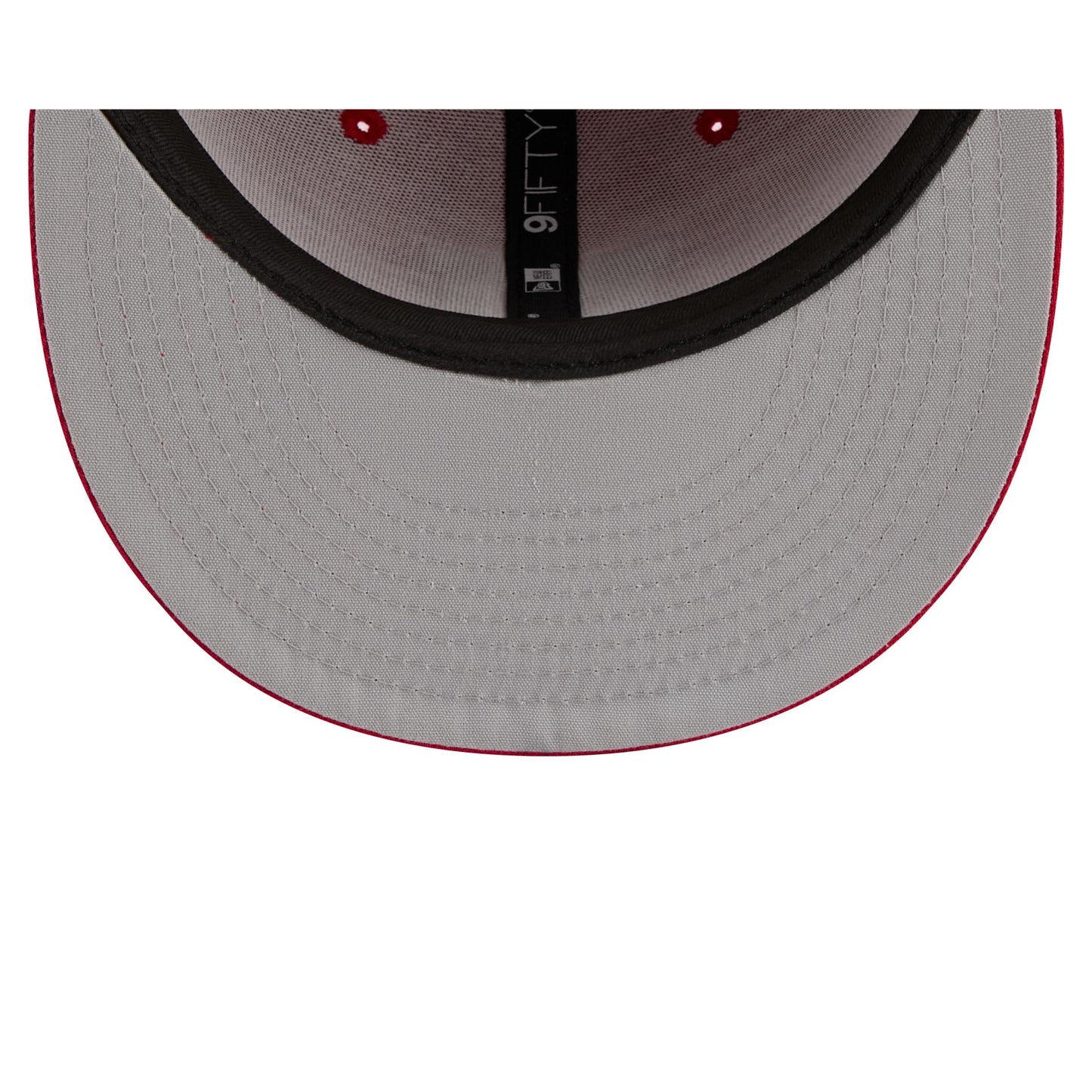 The Nebraska Cornhuskers Sticker Helmet 9FIFTY Snapback features an embroidered Cornhuskers logo at the front panels with embroidered team stickers the back panels. Additional details include an adjustable snapback closure at the rear and a gray undervisor.
