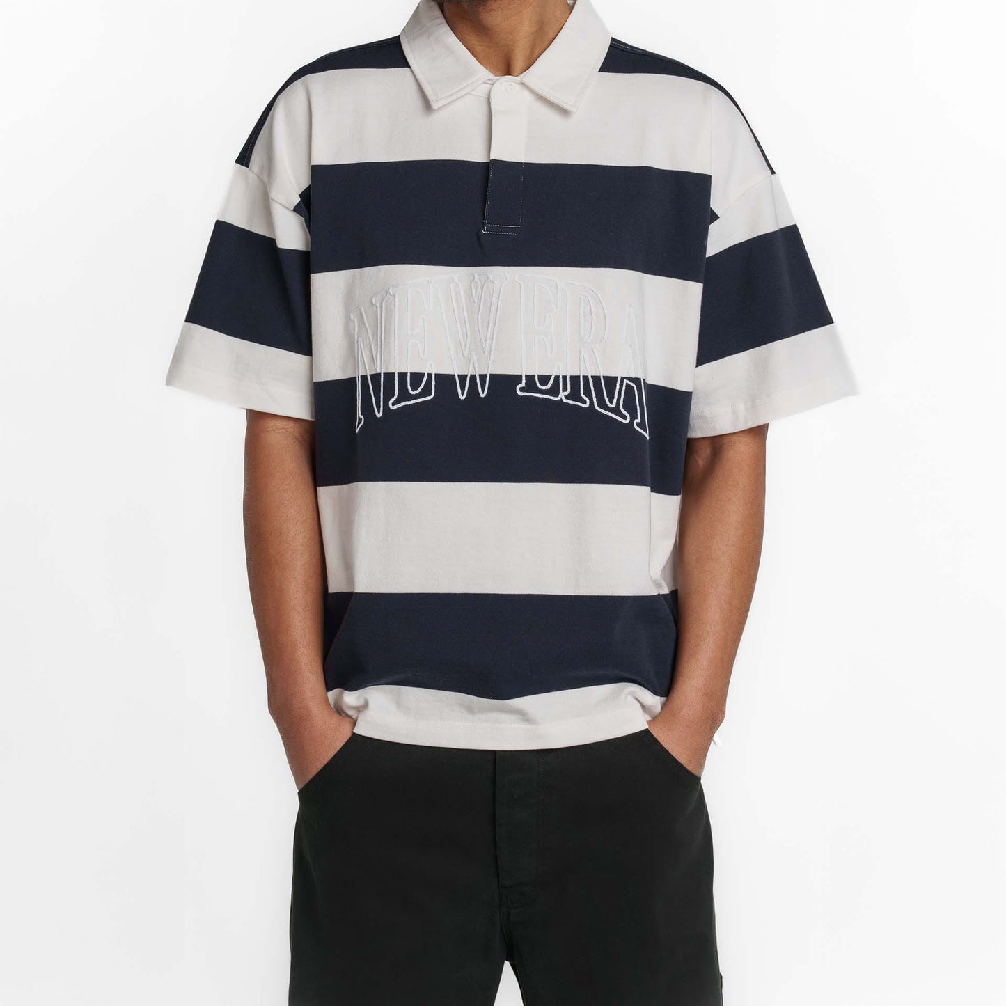 The New Era Branded Embroidered Yarn Dye Navy Rugby Shirt features: