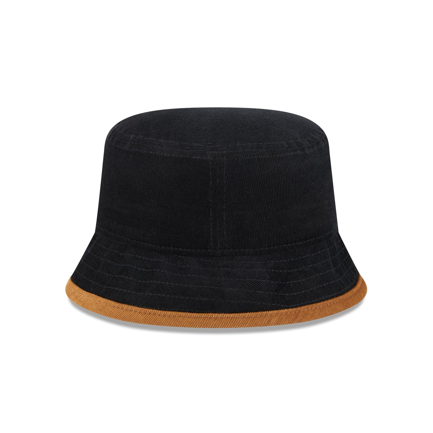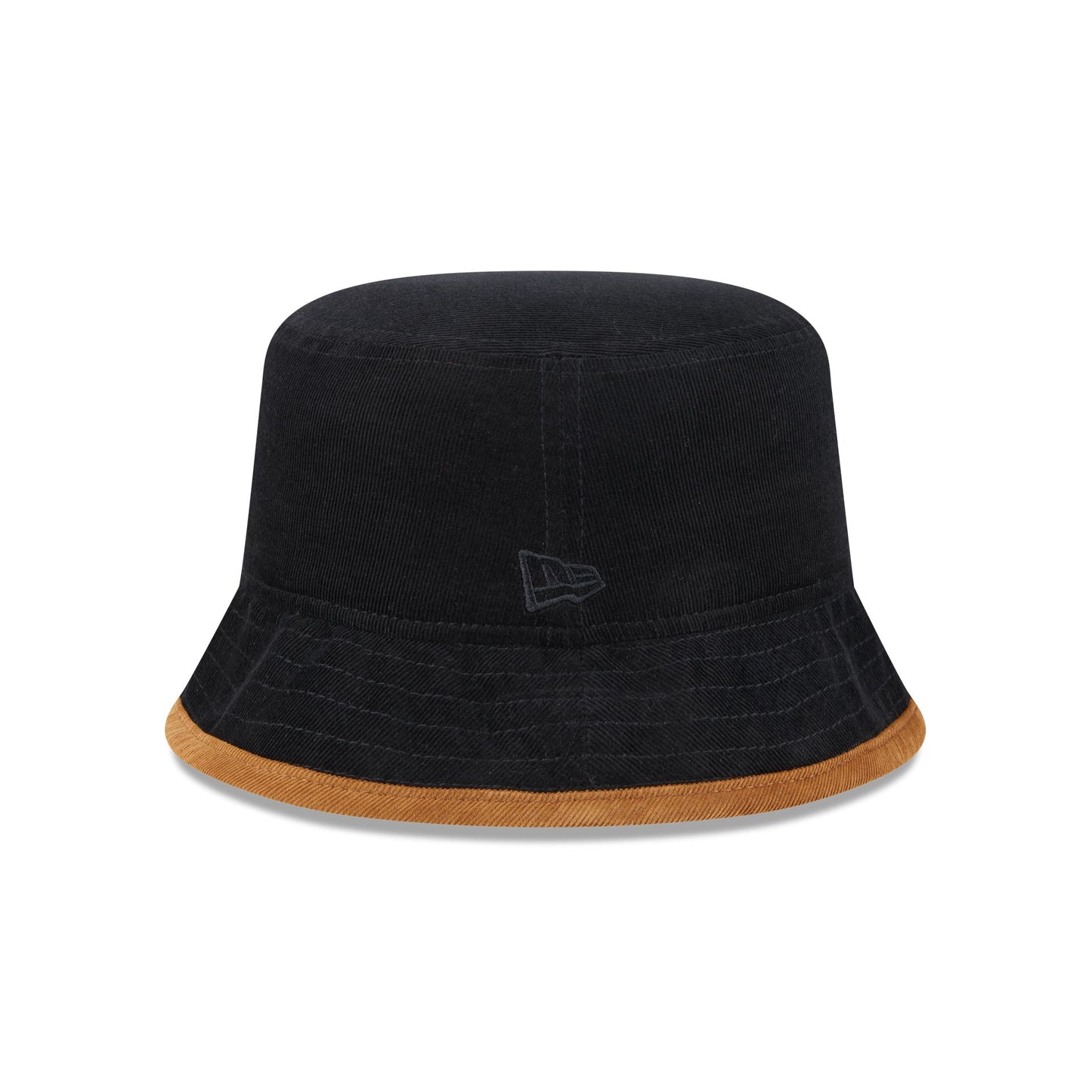 The New Era Cap Black Tiramisu Cord Bucket Hat features a corduroy fabrication, a New Era flag at the left-wear side, and a brown brim.