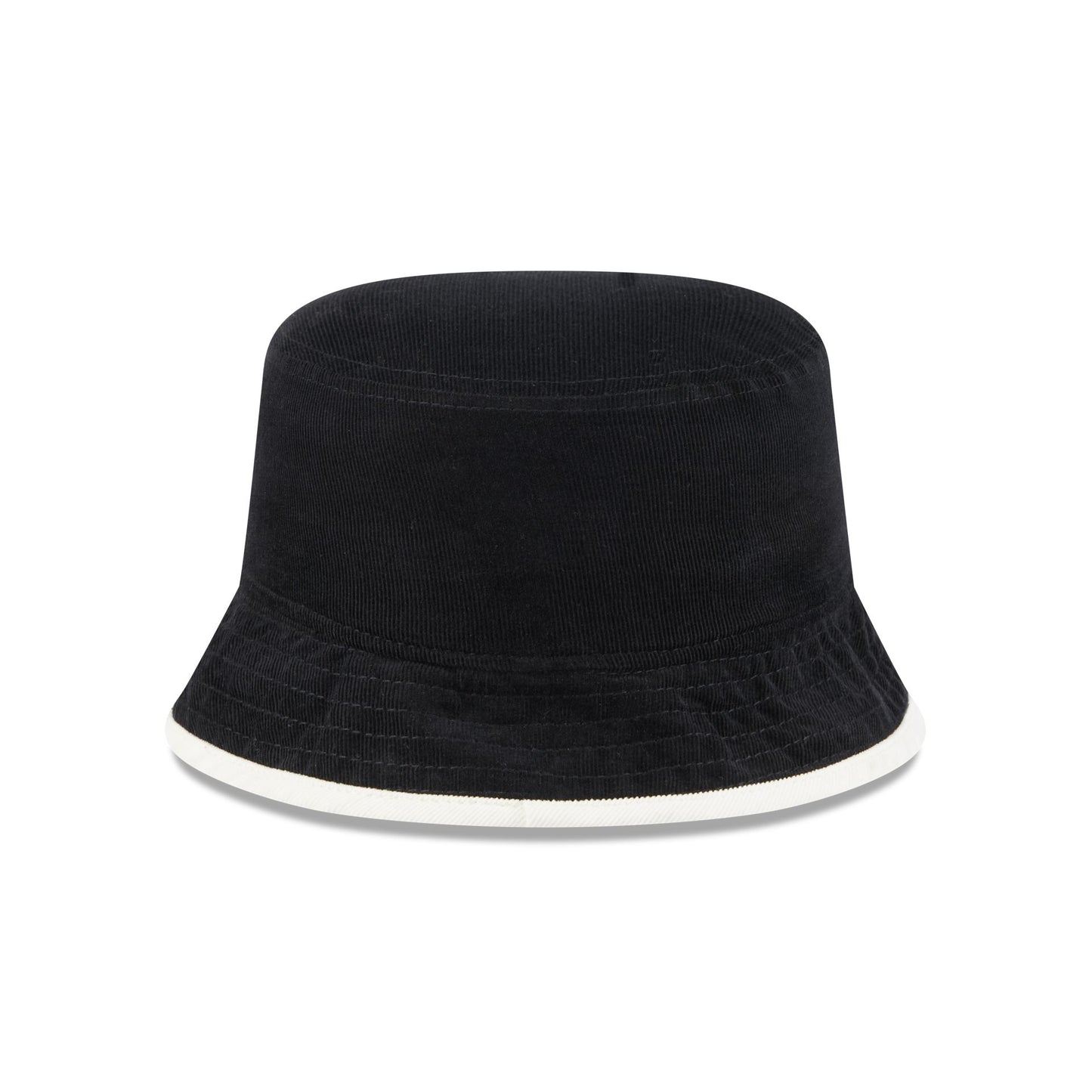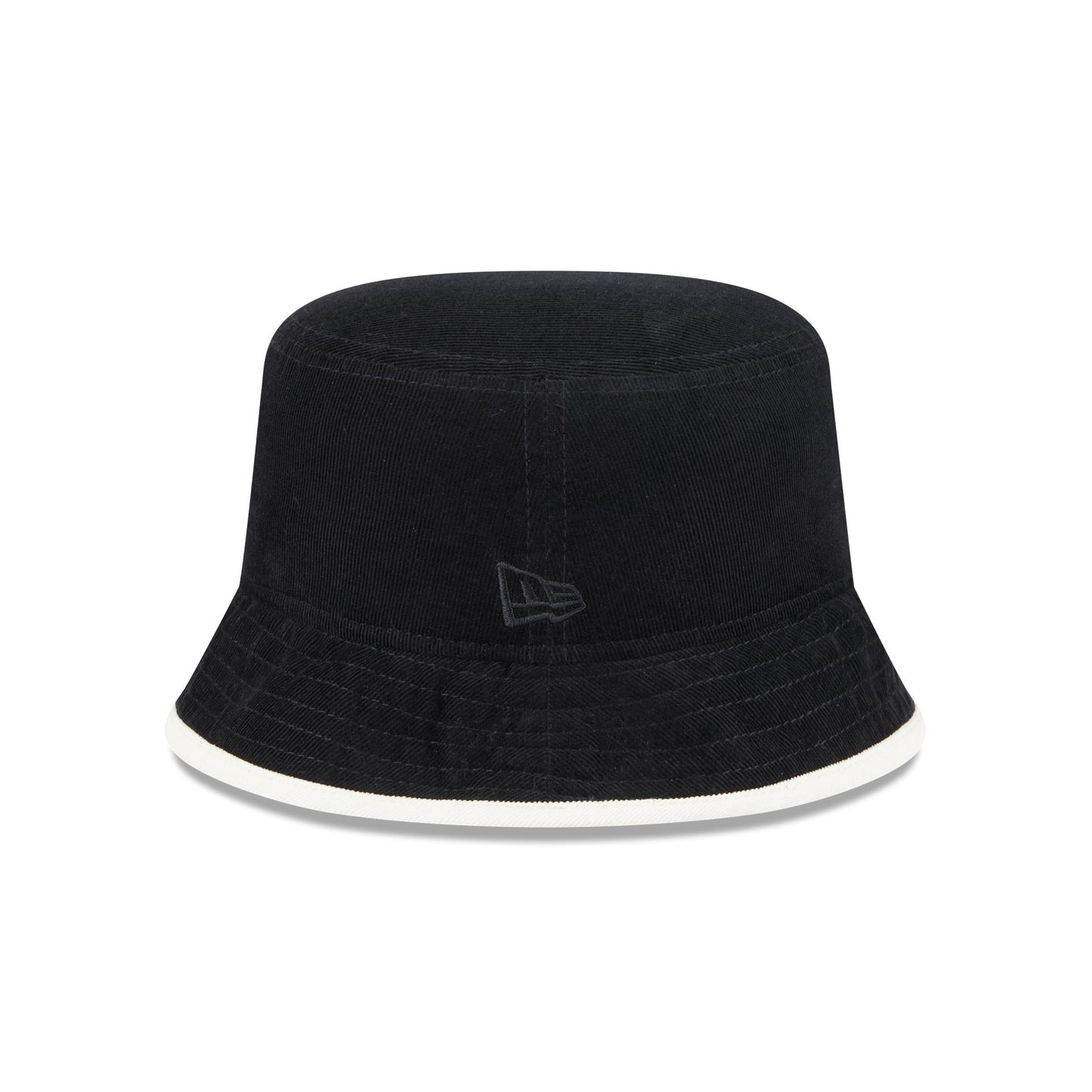 The New Era Cap Black and White Cord Bucket Hat features a corduroy fabrication, a New Era flag at the left-wear side, and a white brim.