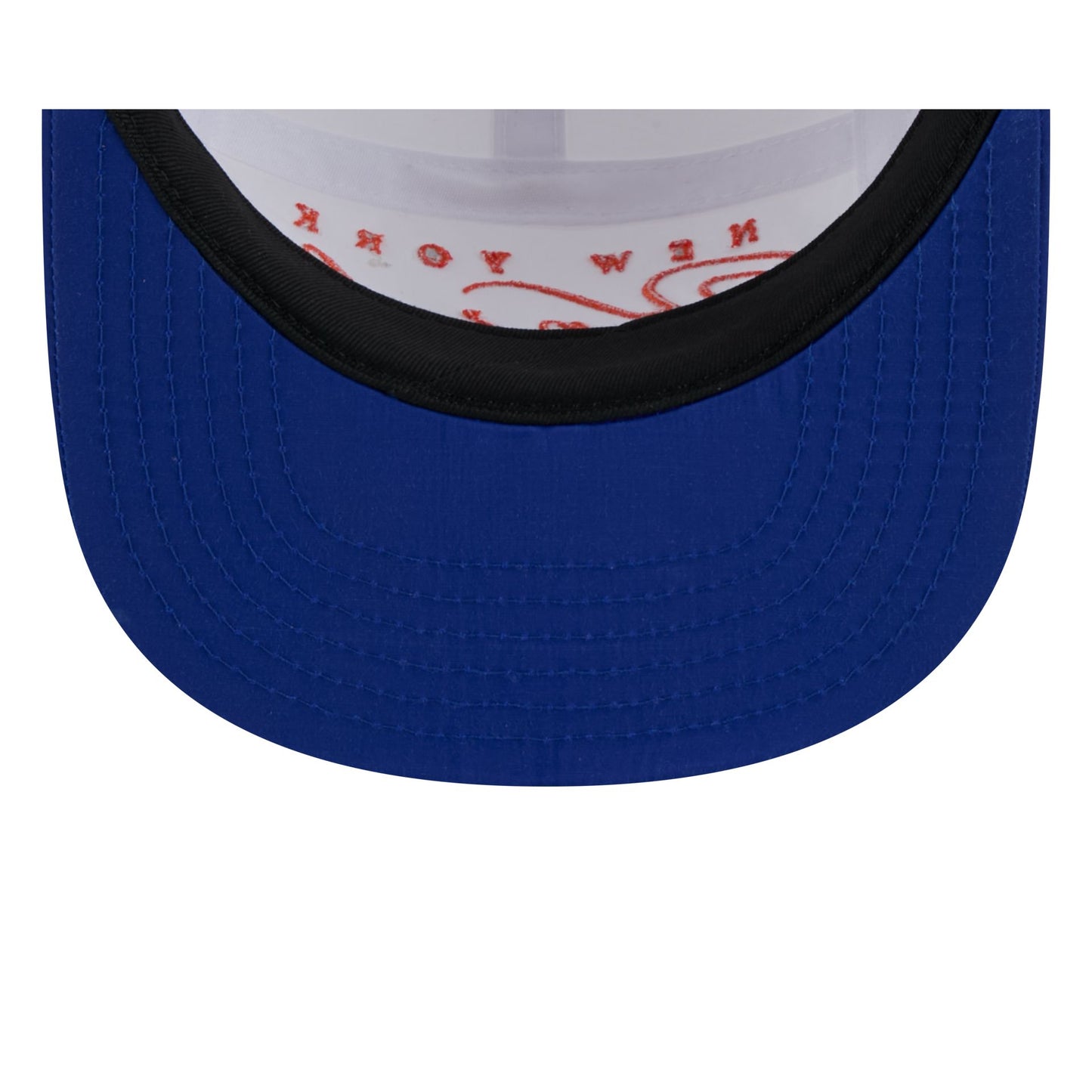The New York Knicks 2025 Draft Camper Strapback features an embroidered Knicks script wordmark at the front panels with a team logo at the right-wear side. Additional details include a woven silicone NBA Logoman patch above an adjustable buckle closure at the rear. The strap features a National Basketball Association gel print wordmark.