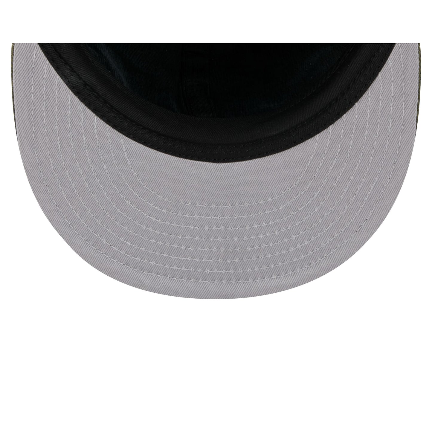 The New York Knicks Three Looms Cotton Twill Camo Retro Crown Dog Ear 59FIFTY Fitted features an embroidered Knicks logo at the front panels with a matching NBA Logoman at the rear. Additional details include fleece camo lined ear covers with a snap button closure and a gray undervisor.