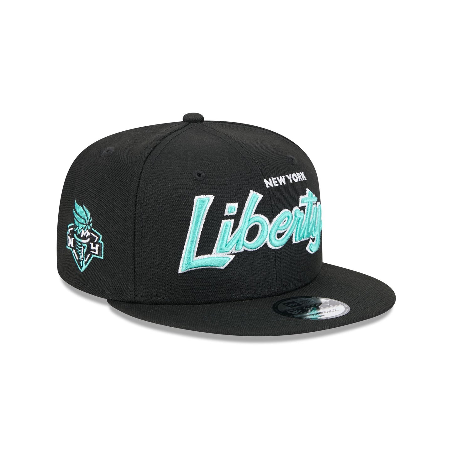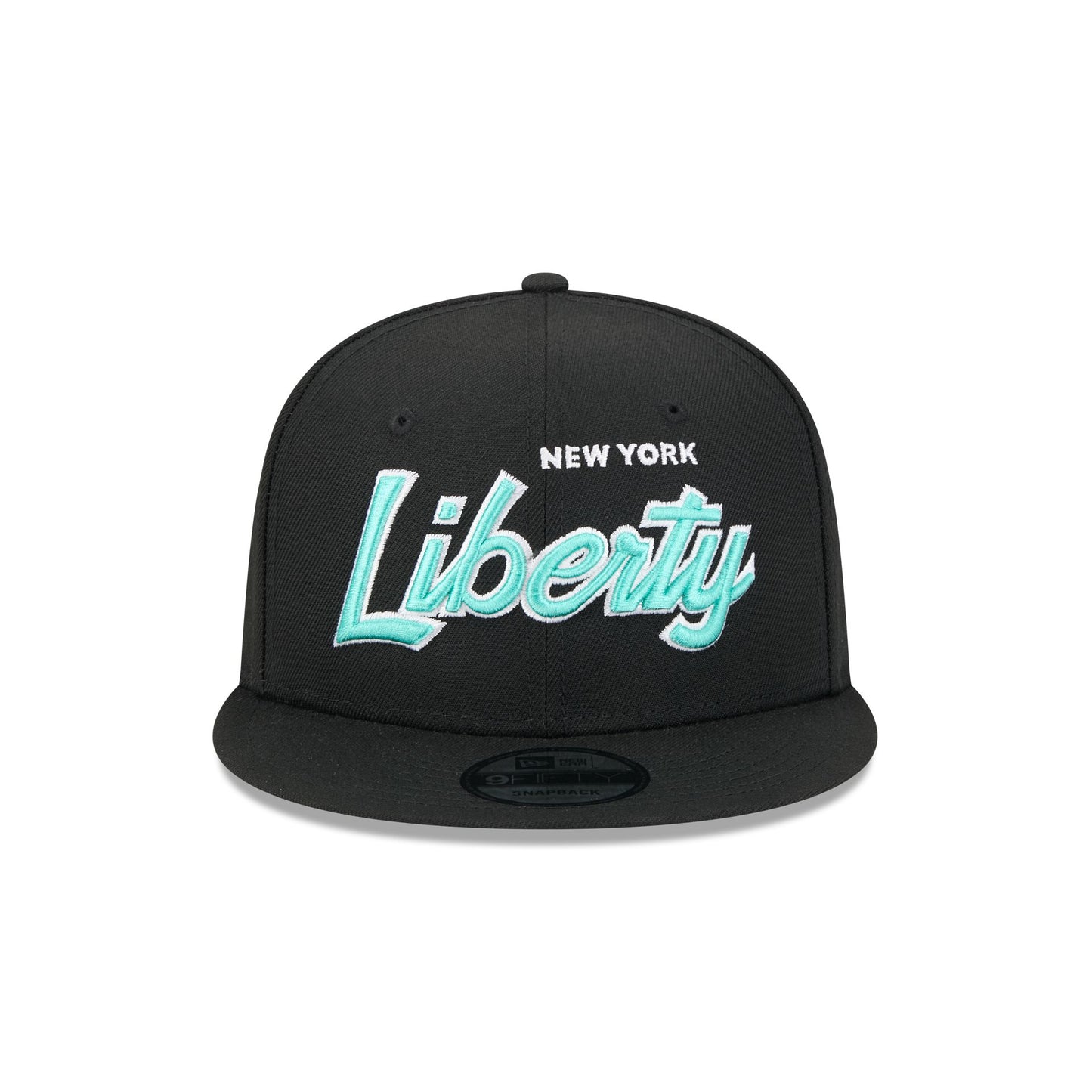 The New York Liberty Script 9FIFTY Snapback Hat features an embroidered Liberty wordmark at the front panels with a matching team logo at the right-wear side. Additional details include and a snapback closure at the rear and a gray undervisor.