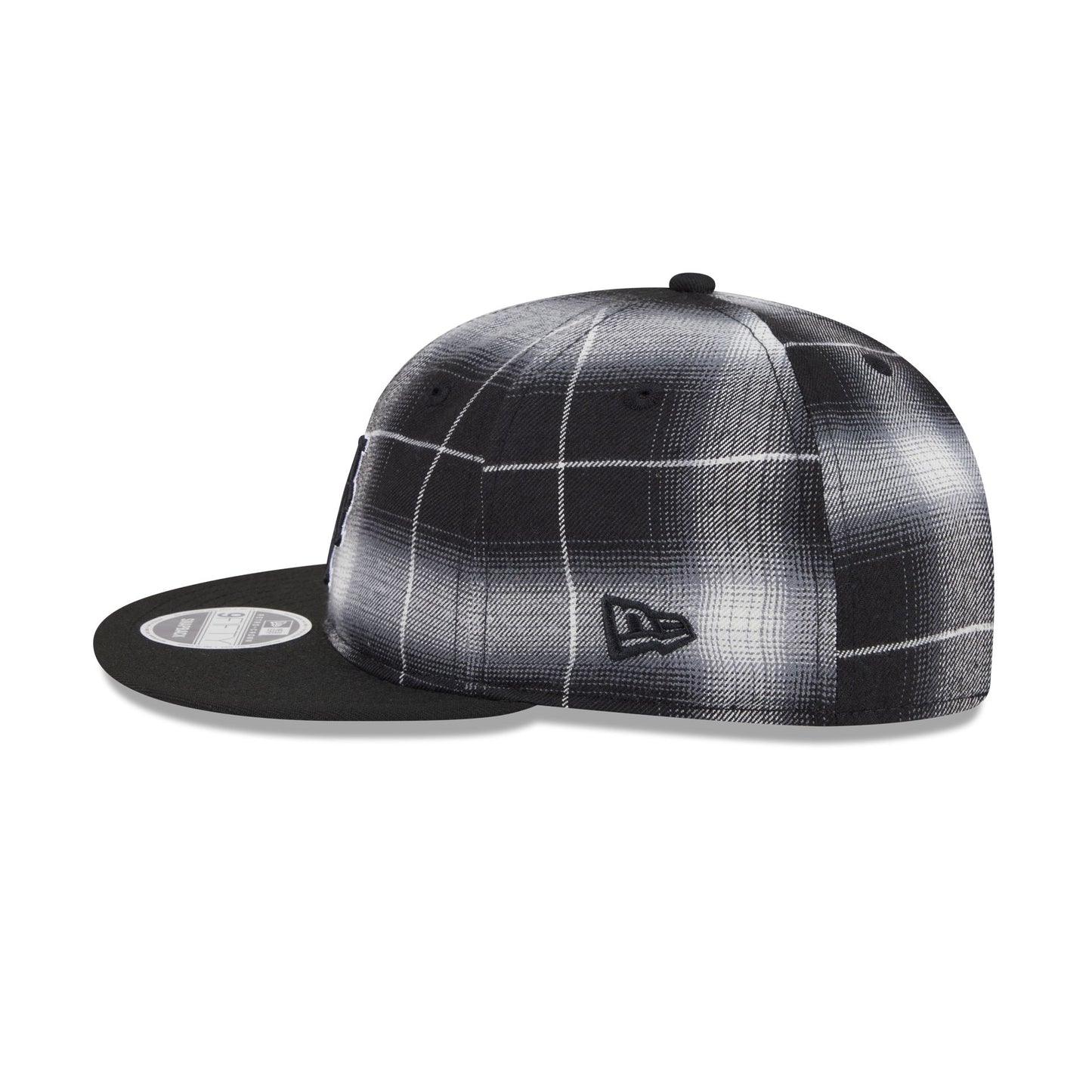 The New York Mets Black and White Plaid Retro Crown 9FIFTY Snapback features an embroidered Mets logo at the front panels with a black visor, a gray undervisor, and a snapback closure at the rear.