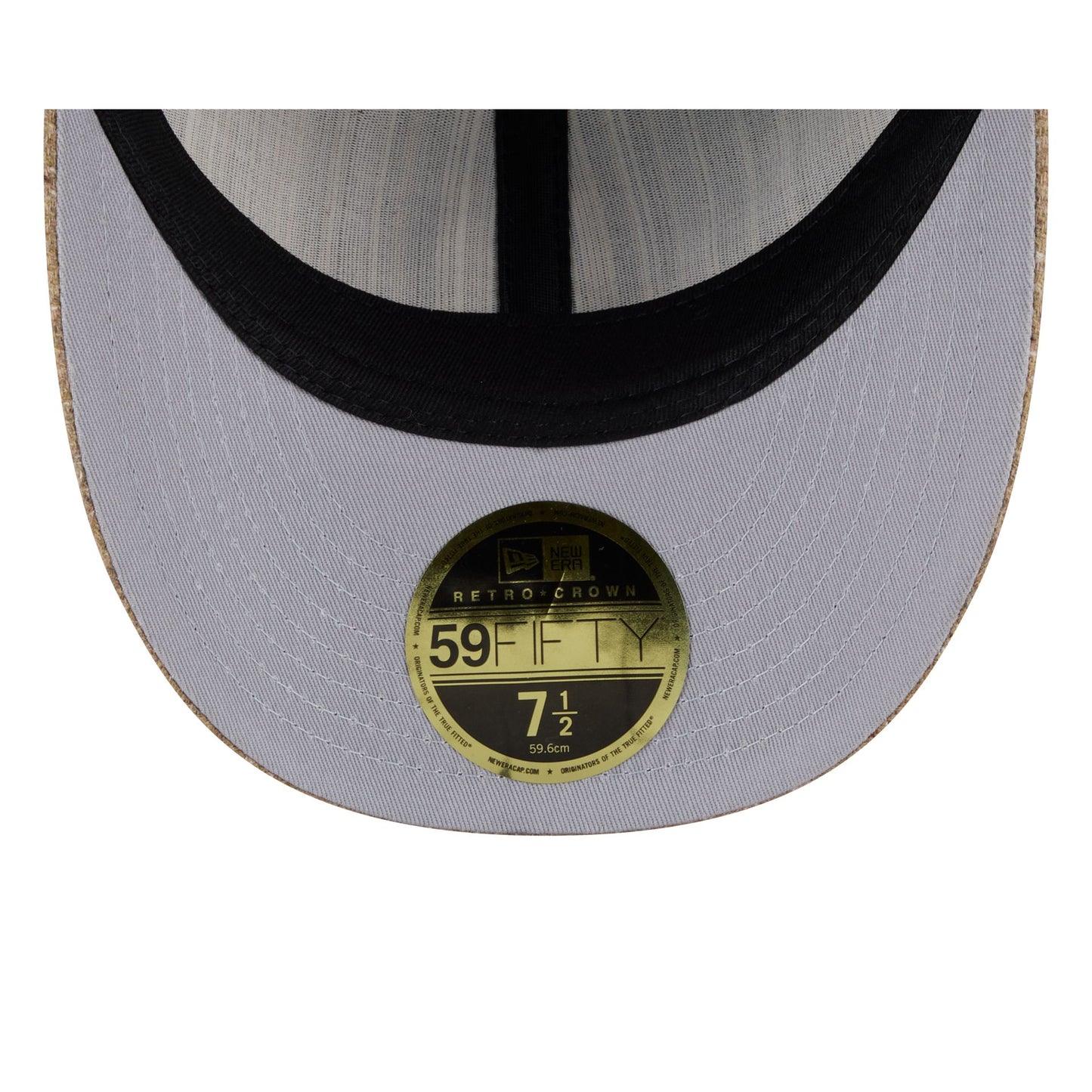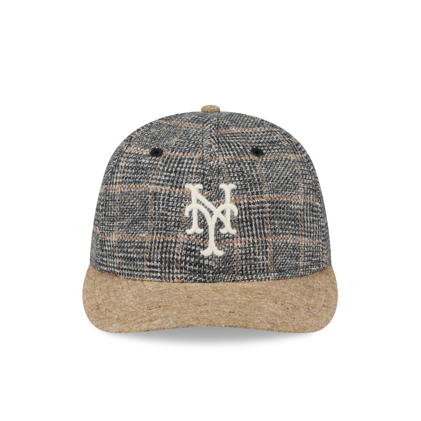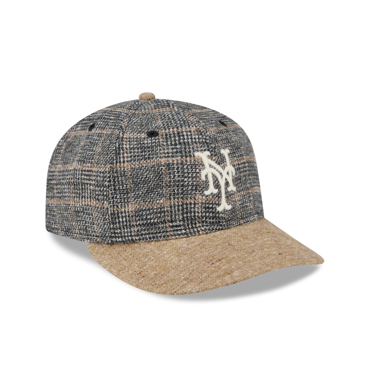 The New York Mets Three Looms Vintage Tweed Retro Crown Pre-Curved 59FIFTY Fitted features an embroidered Mets logo at the front panels with a matching MLB Batterman logo at the rear, a pre-curved tan visor, and a gray undervisor.