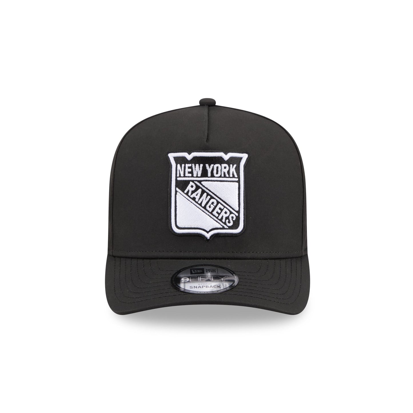 The New York Rangers GORE-TEX Black 9FIFTY A-Frame Snapback features an embroidered white Rangers logo at the front panels with a metallic sheen silicone New Era Flag logo and GORE-TEX logo at the left-wear side. Additional details include an adjustable snapback closure at the rear, a gray undervisor, and a polyester fabrication throughout the cap. It is waterproof, breathable, and lightweight.
