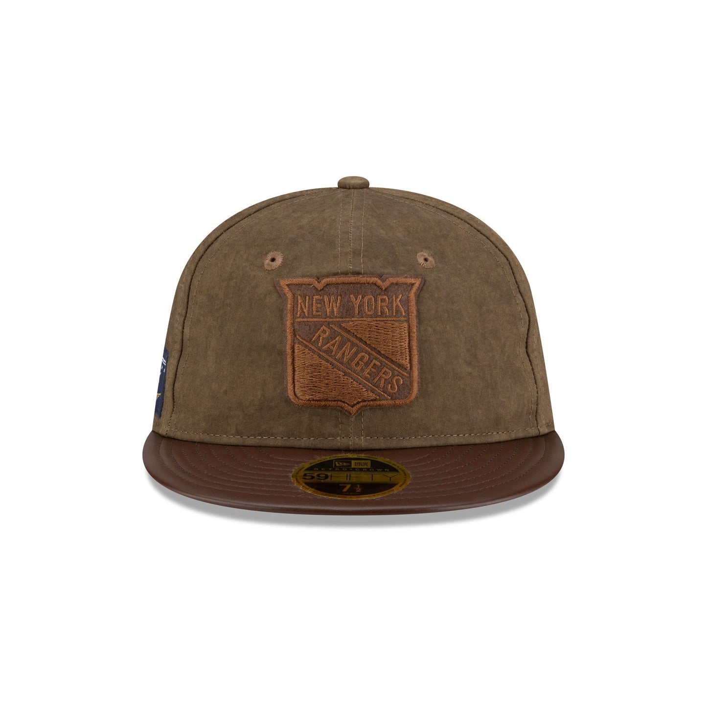 The New York Rangers Utility Linen Retro Crown 59FIFTY Fitted Cap features an embroidered Rangers logo at the front panels with a team patch at the right-wear side. Additional details include a faux leather visor and the NHL Shield logo at the rear.