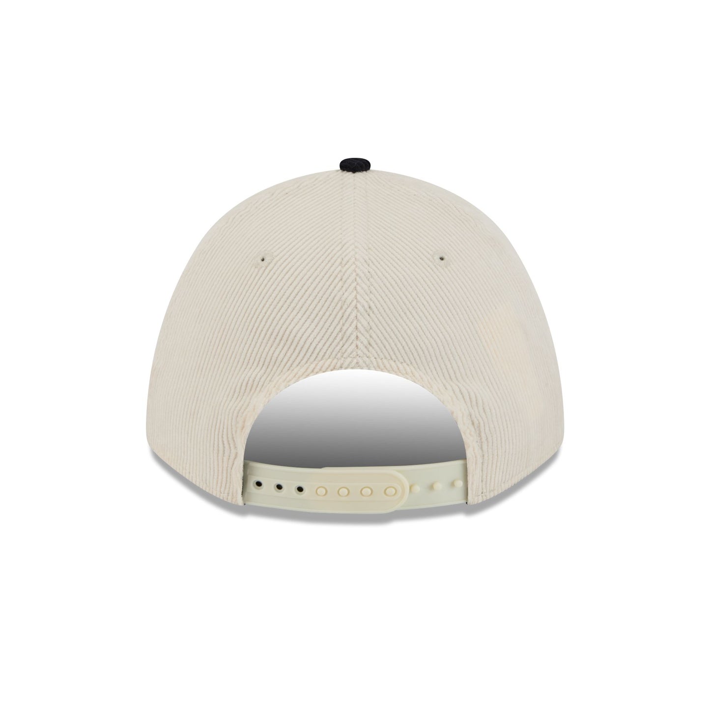 The New York Yankees Stacked Corduroy 9FORTY M-Crown A-Frame Snapback features an embroidered Yankees stacked wordmark at the front panels with a logo at the right-wear side. Additional details include a corduroy fabrication throughout, a snapback closure at the rear, and a gray undervisor.