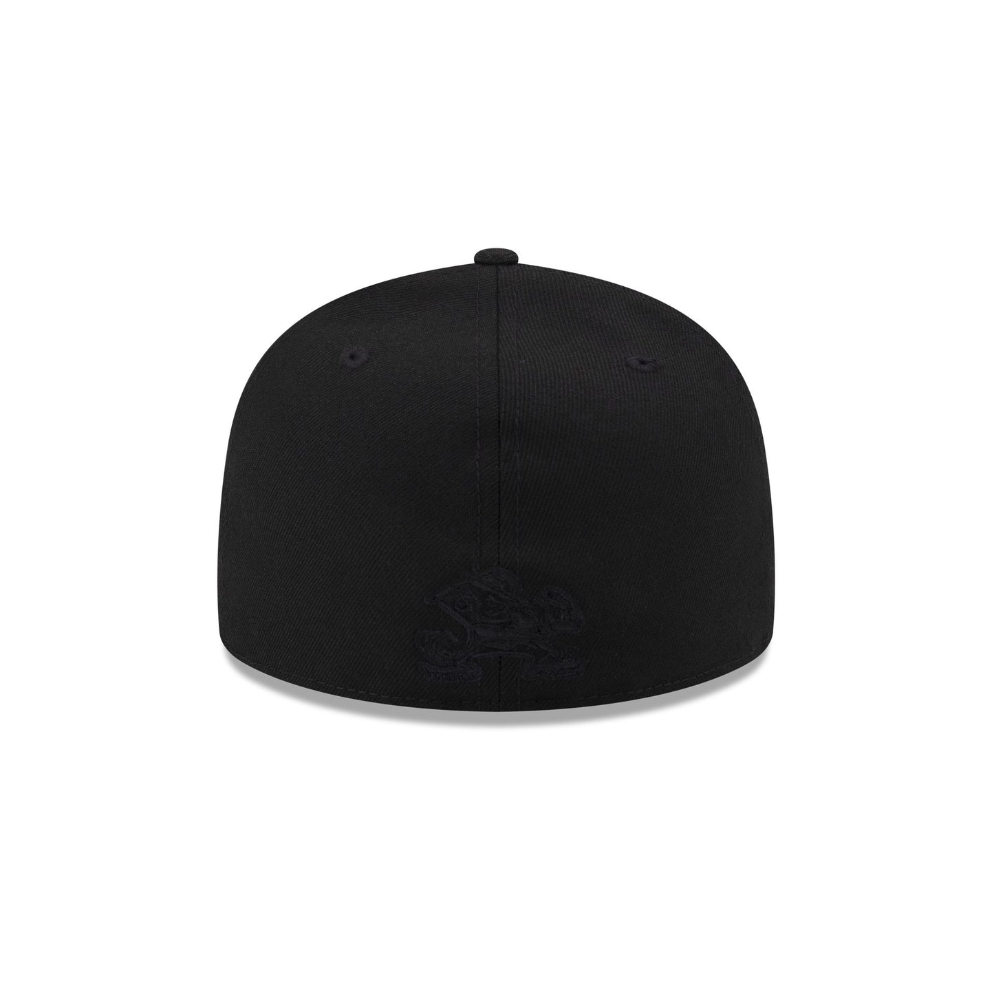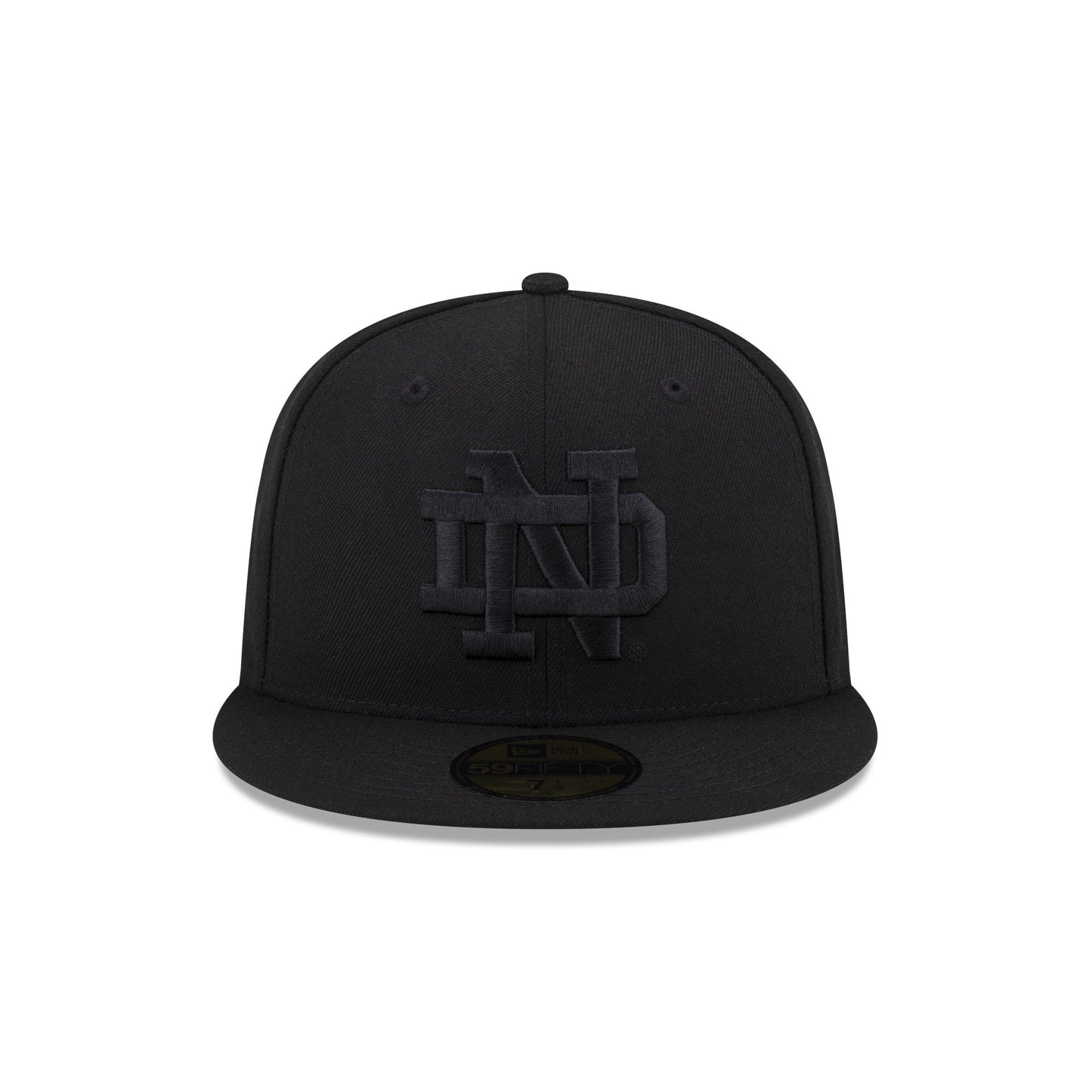 The Notre Dame Fighting Irish Black on Black 59FIFTY Fitted Cap features an embroidered Notre Dame logo at the front panels with a matching logo at the rear and a gray undervisor.