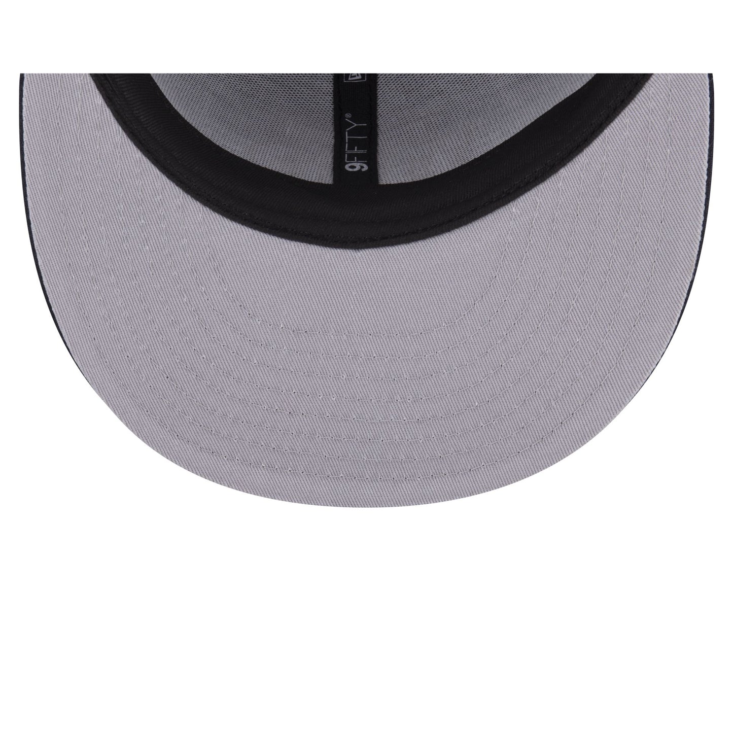 The Notre Dame Fighting Irish Navy 9FIFTY Snapback features an embroidered Notre Dame logo at the front panels with a snapback closure at the rear and a gray undervisor.
