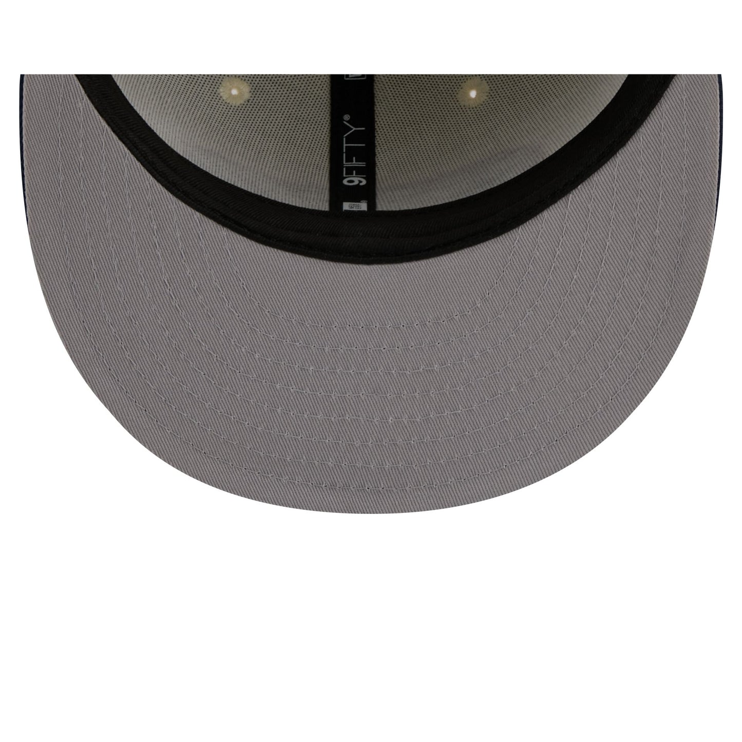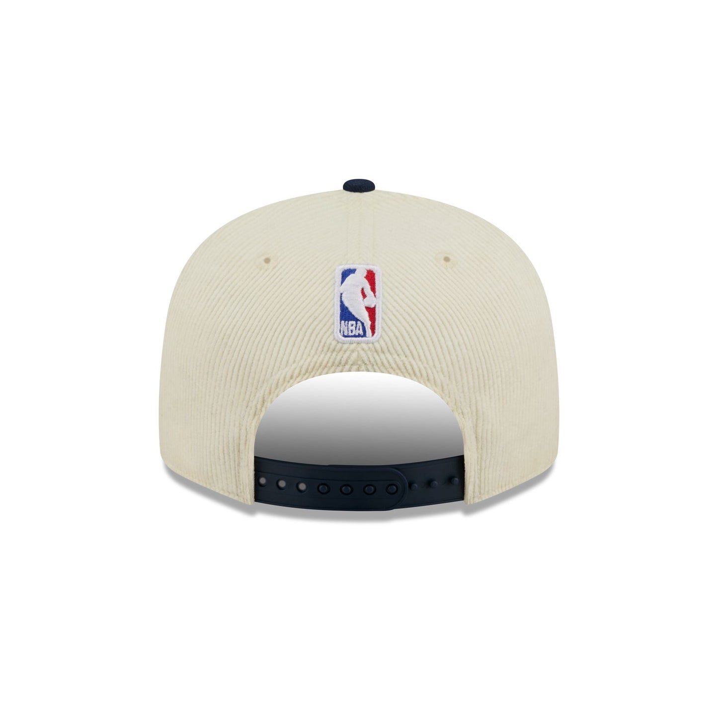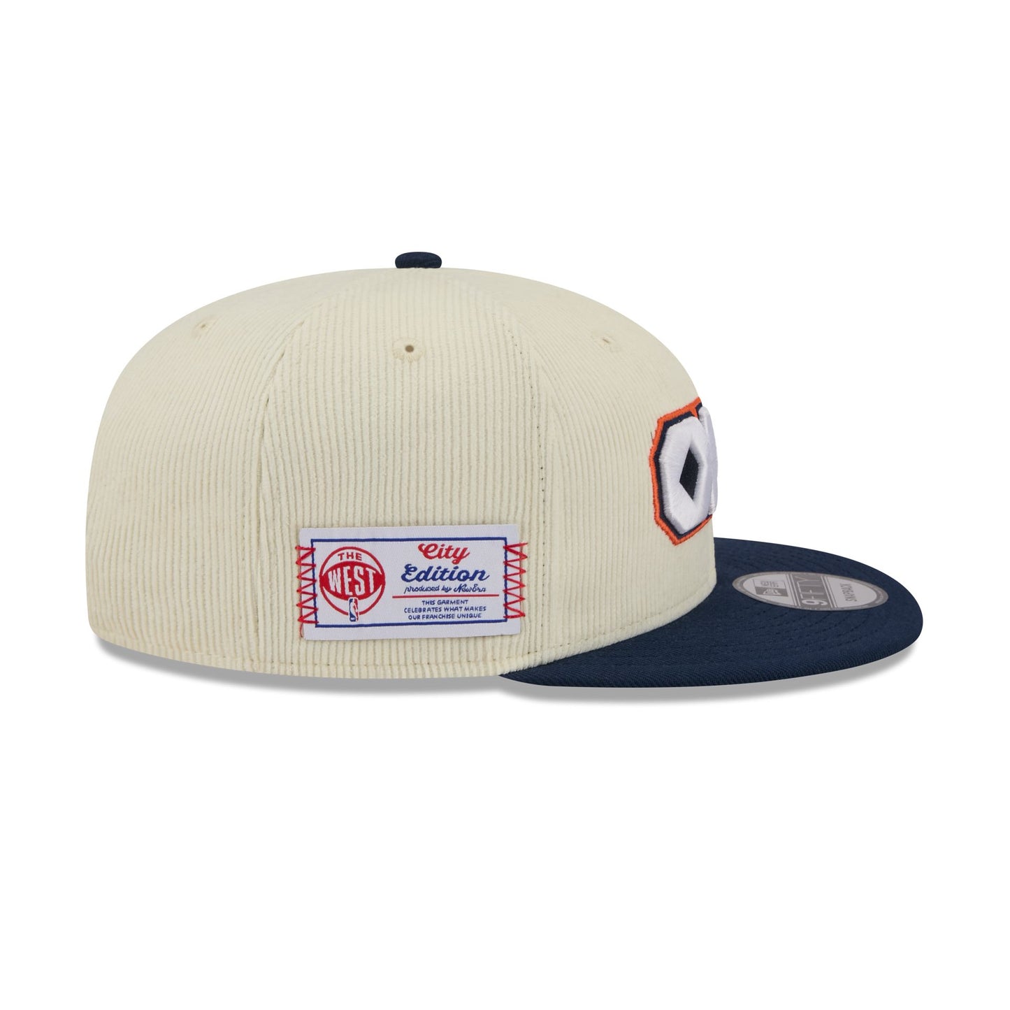 The Oklahoma City Thunder 2025 City Edition Chrome White Corduroy 9FIFTY Snapback features an embroidered Thunder City Edition logo at the front panels with a City Edition jock tag stitched at the right-wear side. Additional details include a corduroy fabrication, the NBA Logoman above an adjustable snapback closure at the rear, and a gray undervisor.