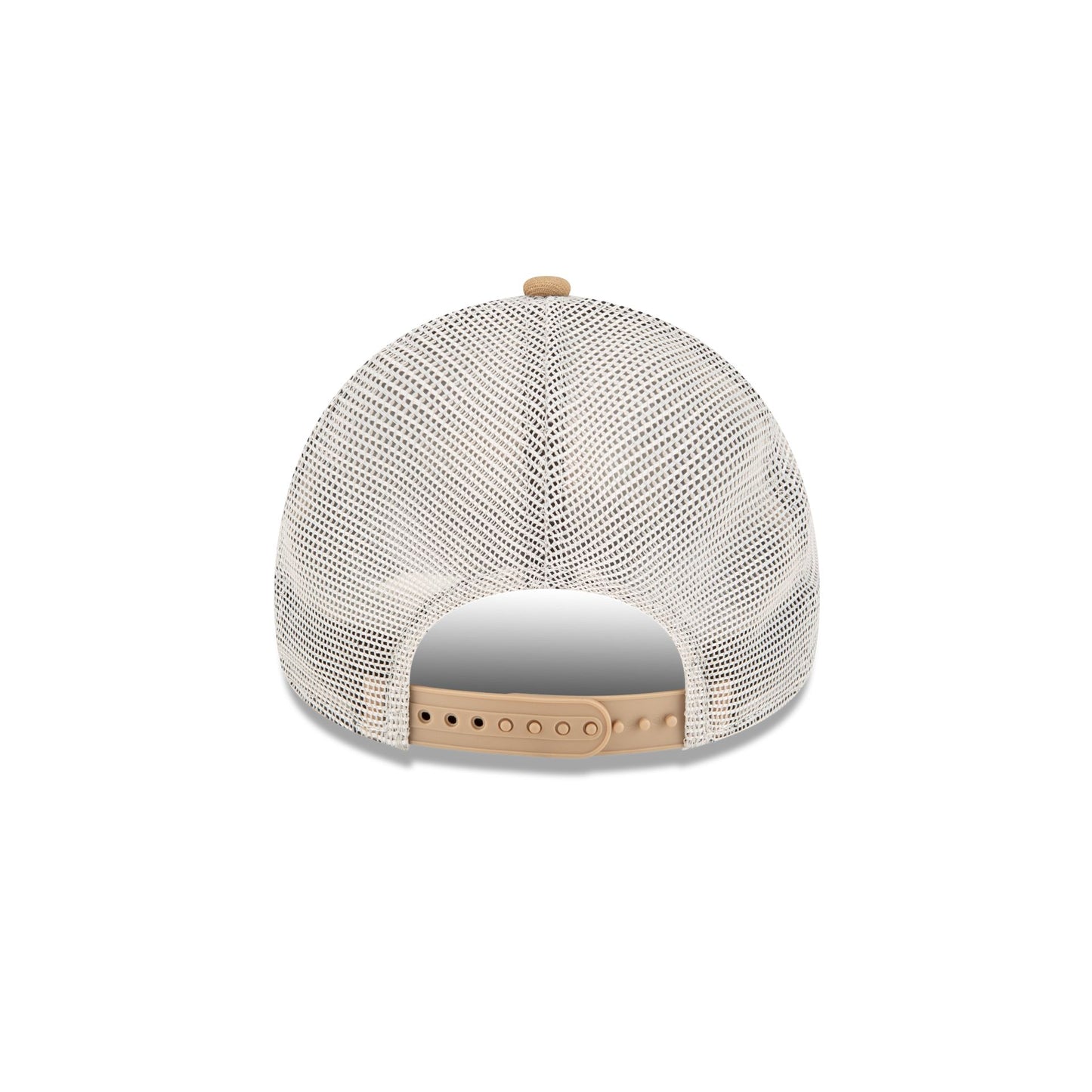 The Oracle Red Bull Racing Essential Khaki 9FORTY A-Frame Trucker features an embroidered Oracle Red Bull Racing wordmark at the front panels with a khaki visor, a gray undervisor, and a snapback closure at the rear.