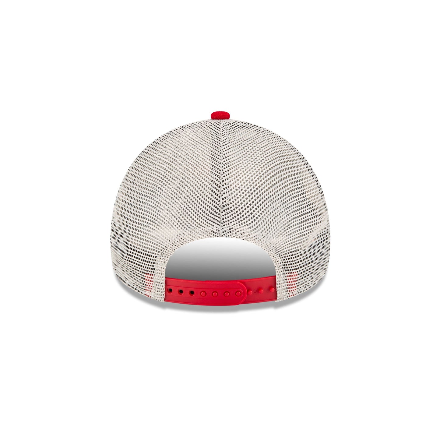 The Oracle Red Bull Racing Essential White 9FORTY A-Frame Trucker features an embroidered Oracle Red Bull Racing wordmark at the front panels with a red visor, a gray undervisor, and a snapback closure at the rear.