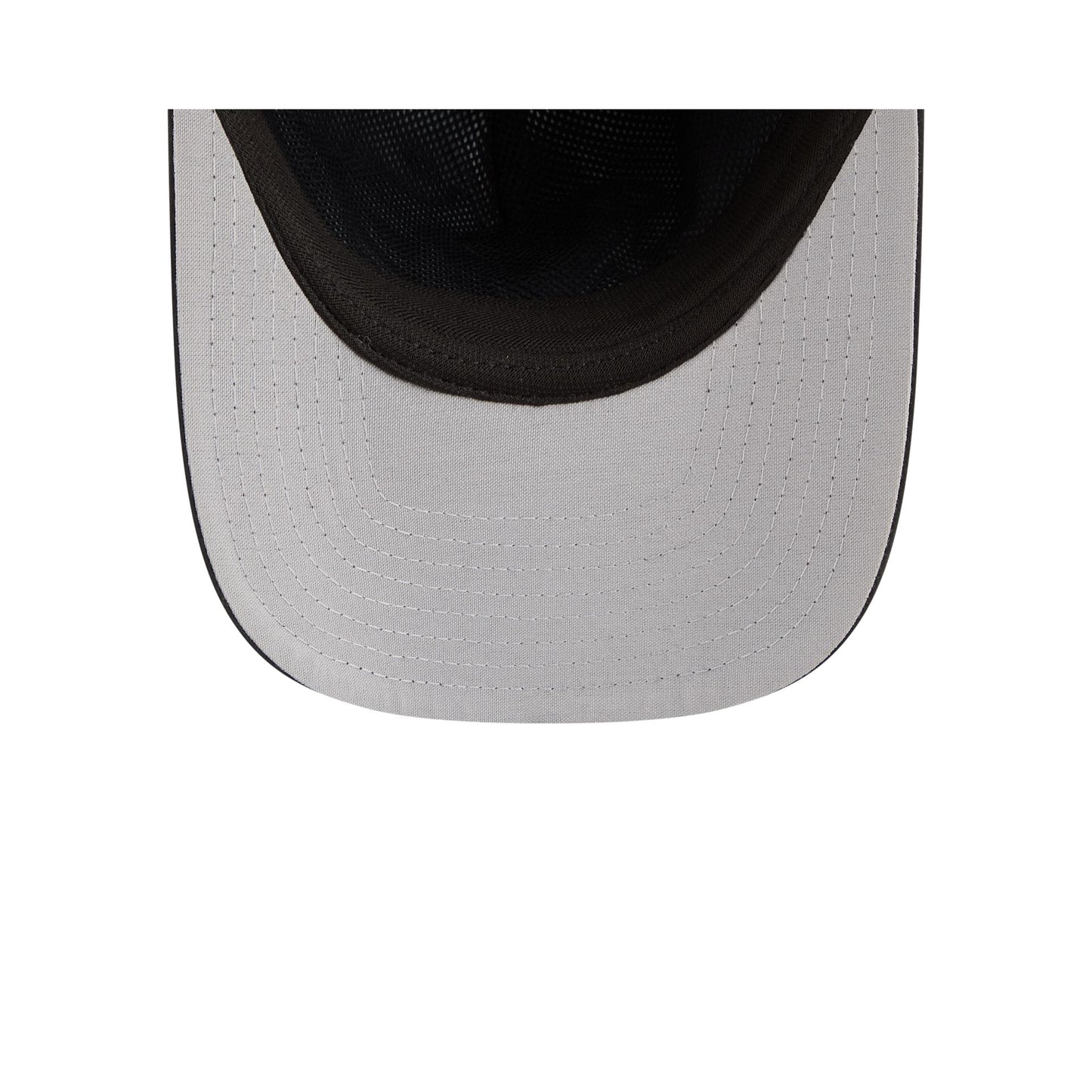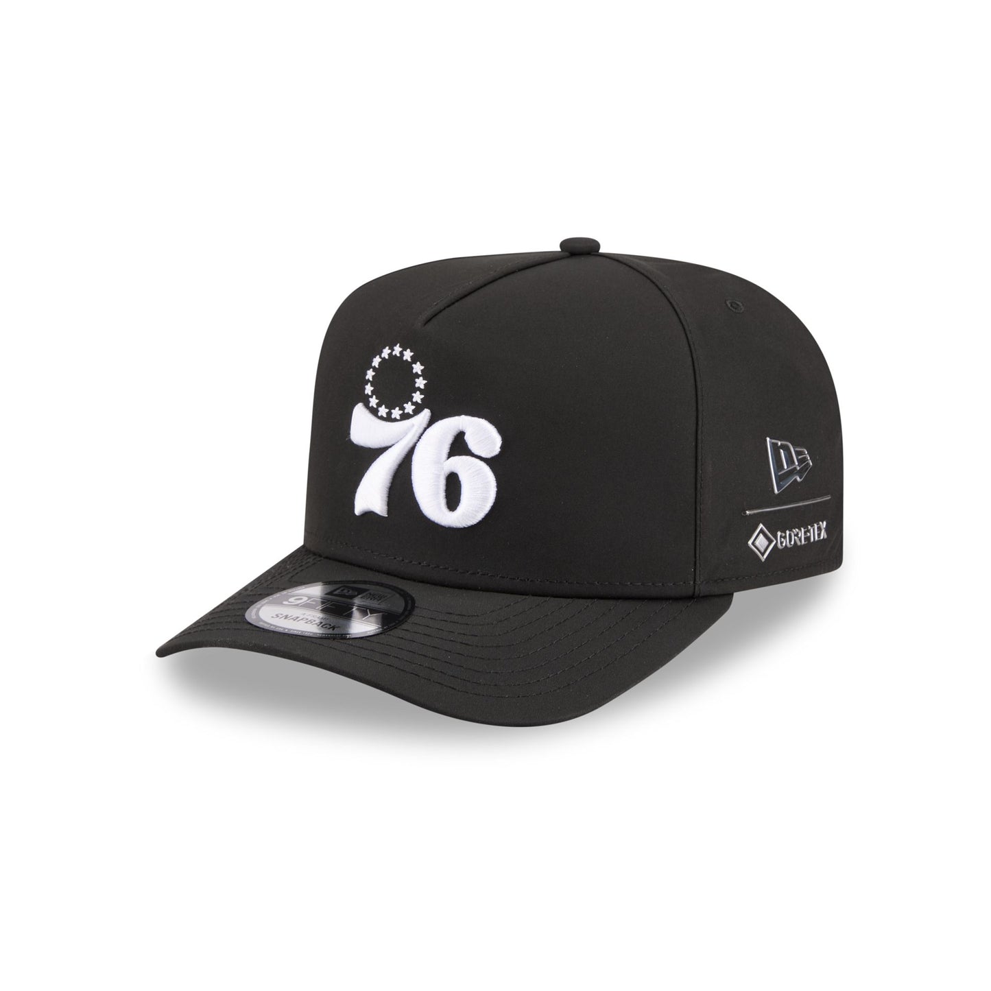 The Philadelphia 76ers GORE-TEX Black 9FIFTY A-Frame Snapback features an embroidered white 76ers logo at the front panels with a metallic sheen silicone New Era Flag logo and GORE-TEX logo at the left-wear side. Additional details include an adjustable snapback closure at the rear, a gray undervisor, and a polyester fabrication throughout the cap. It is waterproof, breathable, and lightweight.