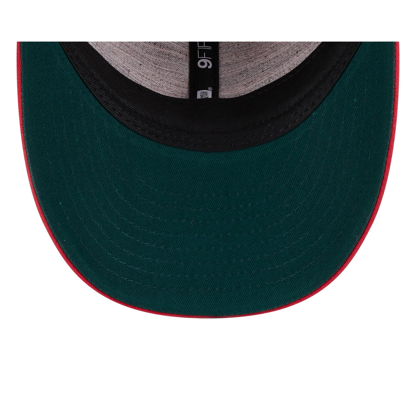 The Philadelphia Phillies Canvas Felt Retro Crown 9FIFTY Strapback Cap features an embroidered Phillies logo at the front panels with a matching MLB Batterman logo at the right rear. Additional details include an adjustable D-Ring closure at the rear and a green undervisor.