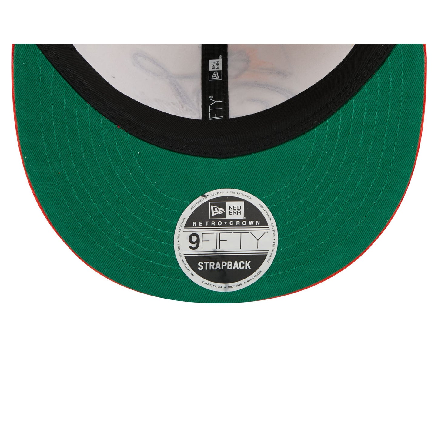 The Phoenix Suns Pinstripe Script Retro Crown 9FIFTY Adjustable Cap features an embroidered Suns logo and cursive wordmark at the front panels wit an adjustable belt closure at the rear and a green undervisor.