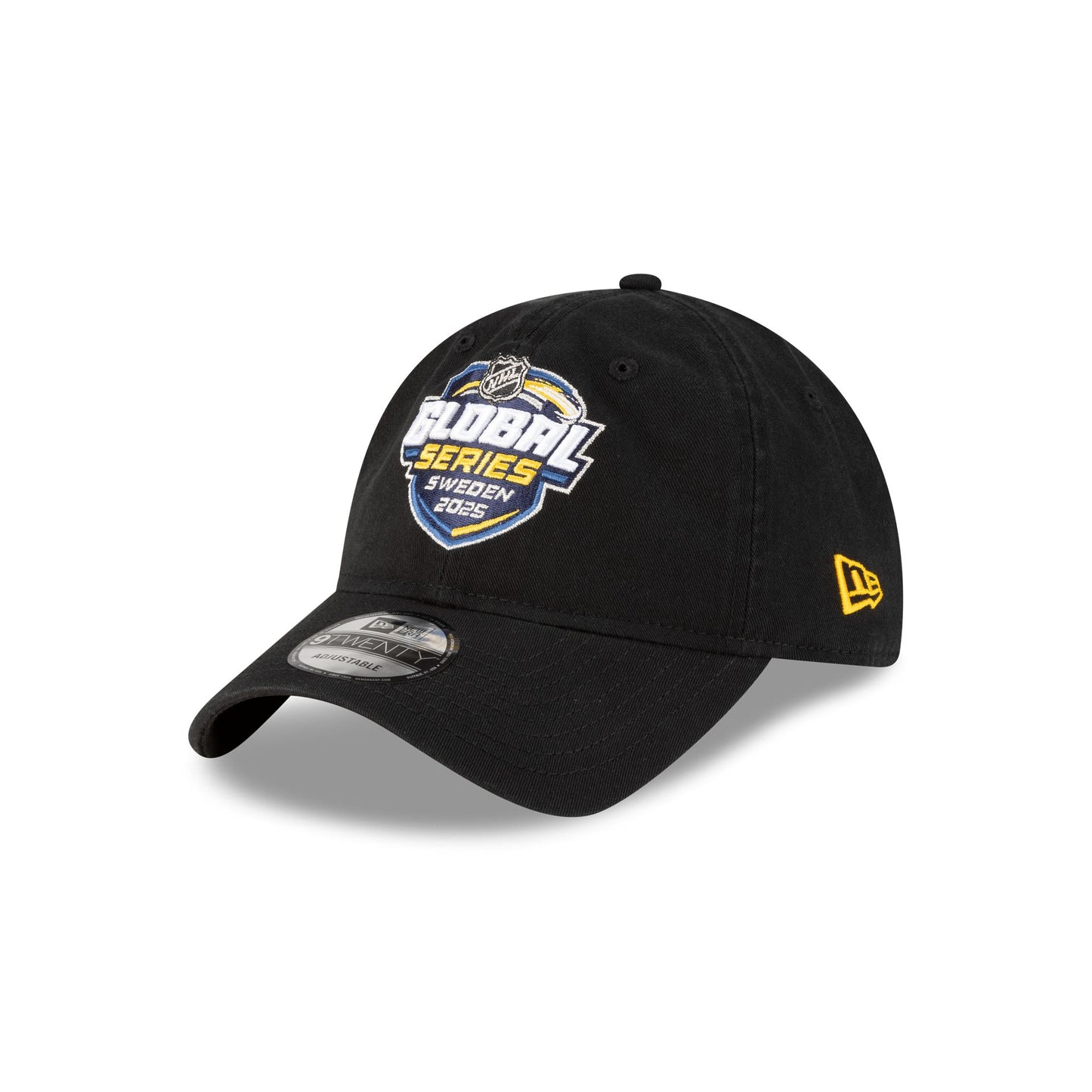 The Pittsburgh Penguins 2025 Global Series 9TWENTY Adjustable Cap features an embroidered 2025 NHL Global Series logo at the front panels with a team logo at the right-wear side and an adjustable D-Ring closure at the rear.