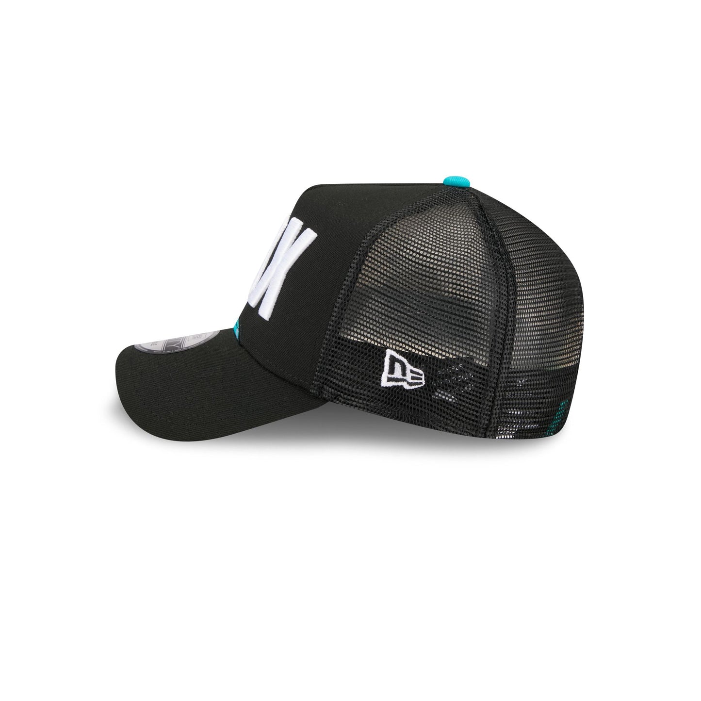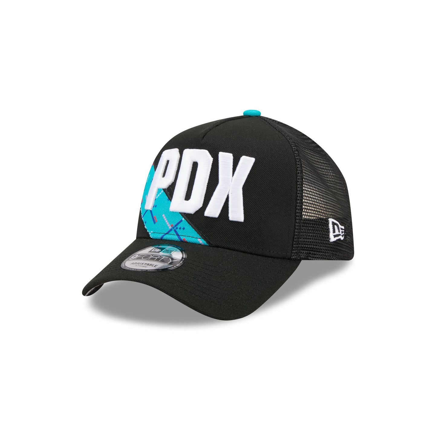 The Portland Trail Blazers 2025 City Edition 9FORTY A-Frame Trucker features an embroidered Trail Blazers City Edition logo at the front panels with a logo at the right-wear side. Additional details include the NBA Logoman above an adjustable snapback closure at a mesh rear and a gray undervisor.