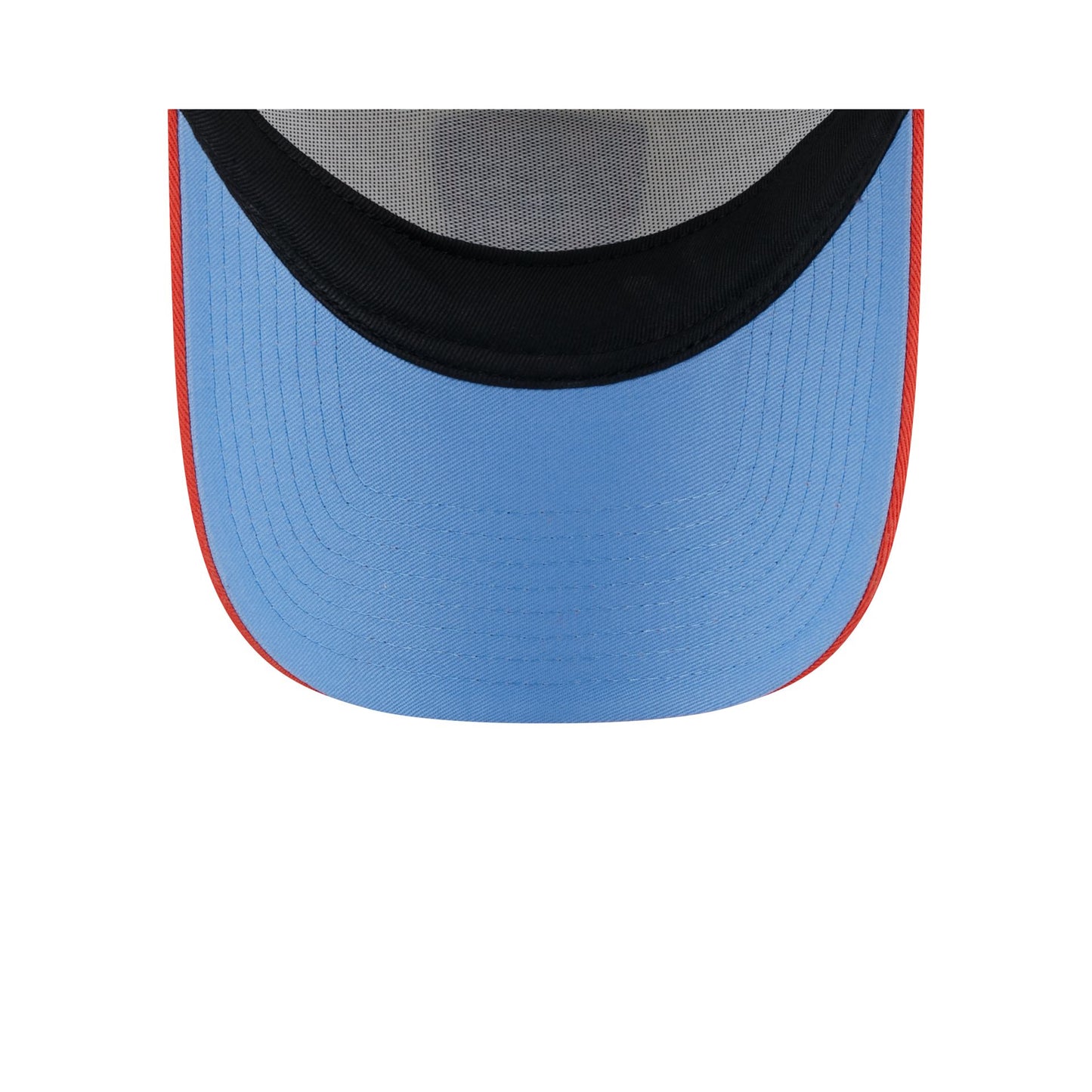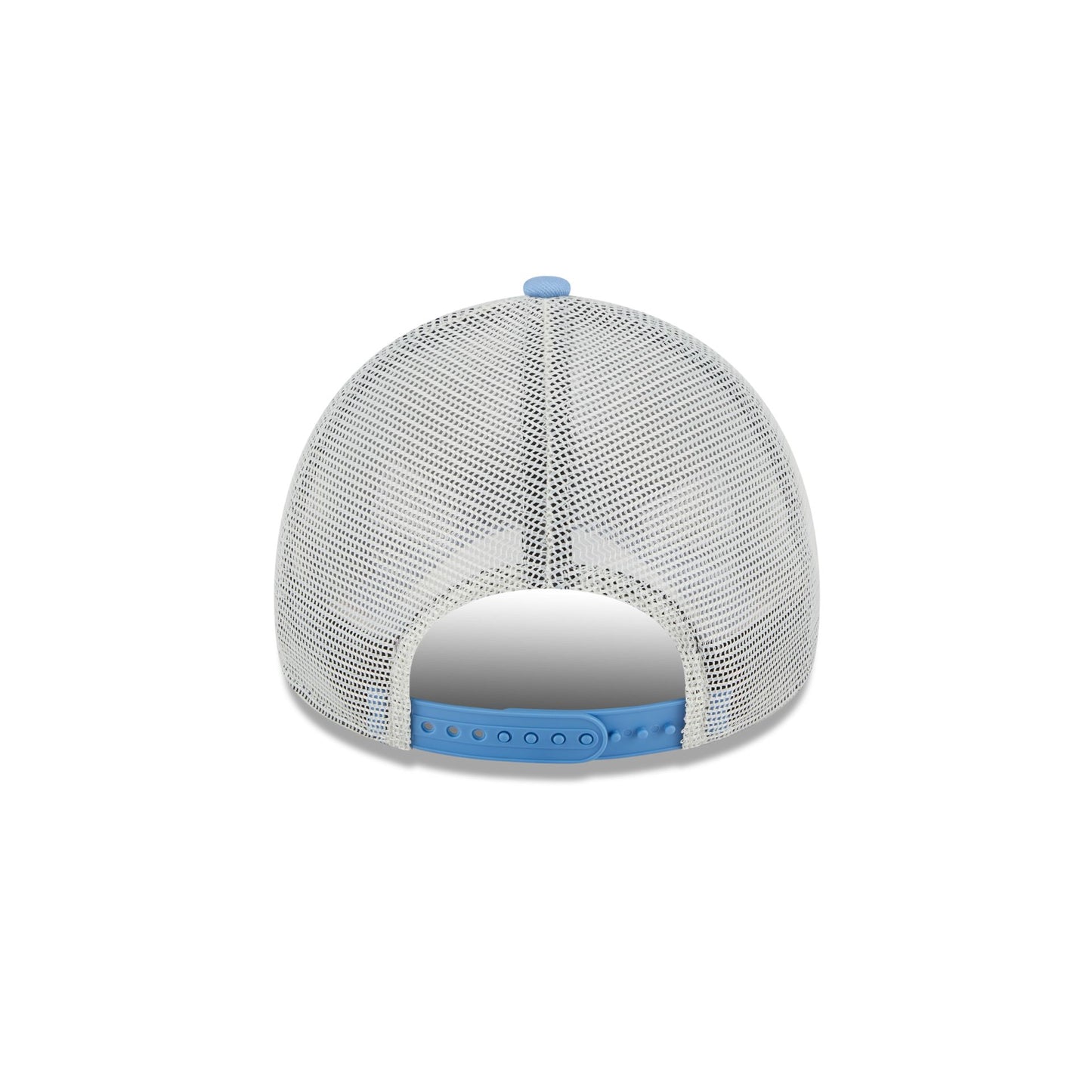 The Rayados Alt Team Color 9FORTY Trucker features an embroidered Rayados logo at the front panel with an orange visor, blue undervisor, and a snapback closure at the rear.