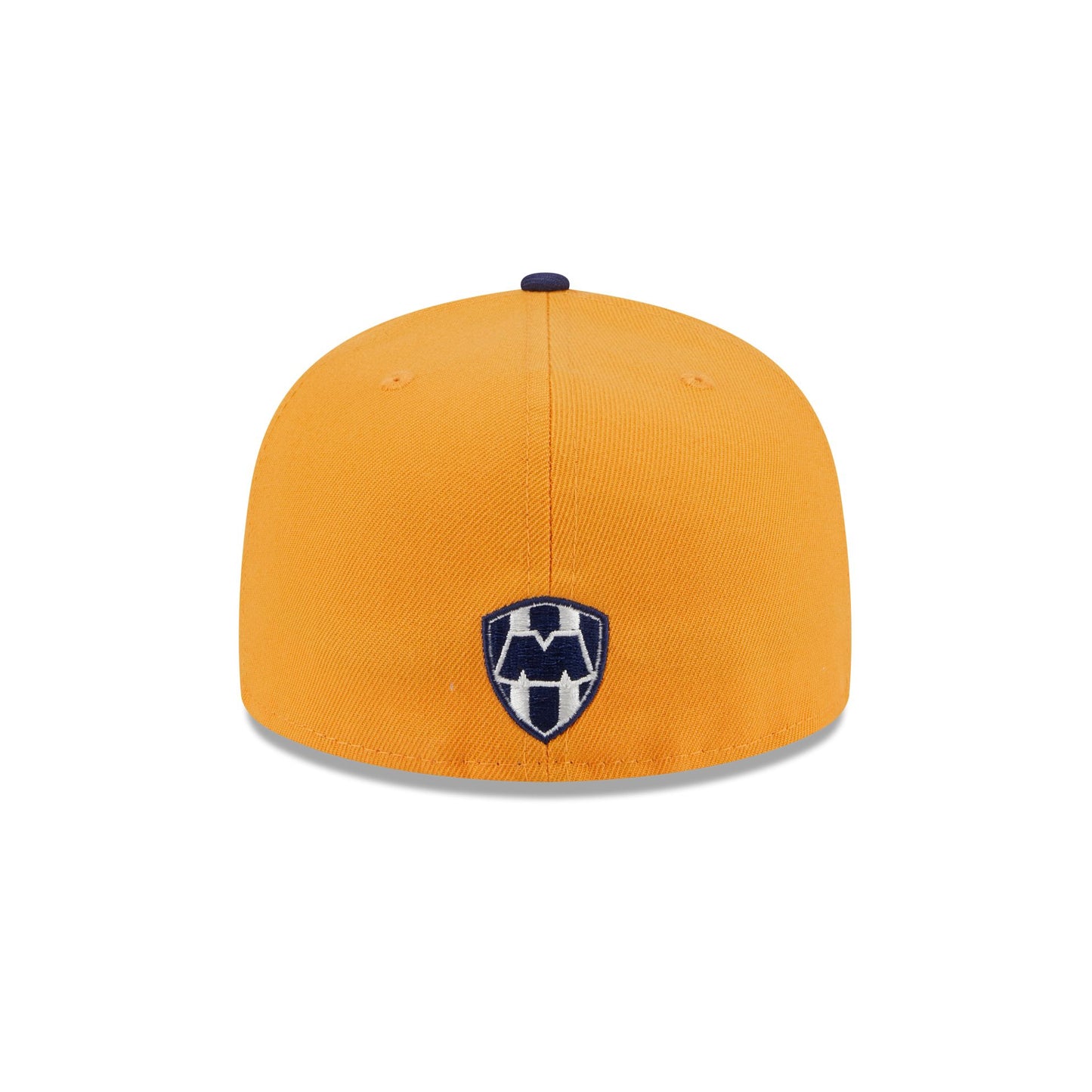 The Rayados Retro Logo 59FIFTY Fitted Cap features an embroidered Rayados retro navy logo at the front panels with the current team logo at the rear. Additional details include the team's established date at the right-wear side, a navy undervisor, and a duel colored crown.