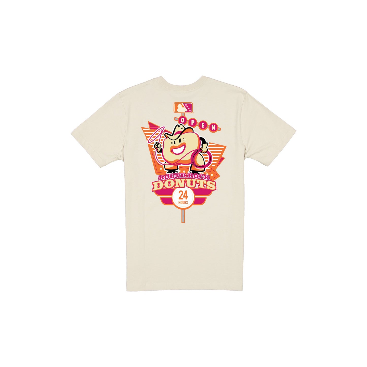 The Round Rock Express Chrome Food Pack T-Shirt features a screen-printed Express Donuts themed logo at the left chest with a matching graphic at the rear.