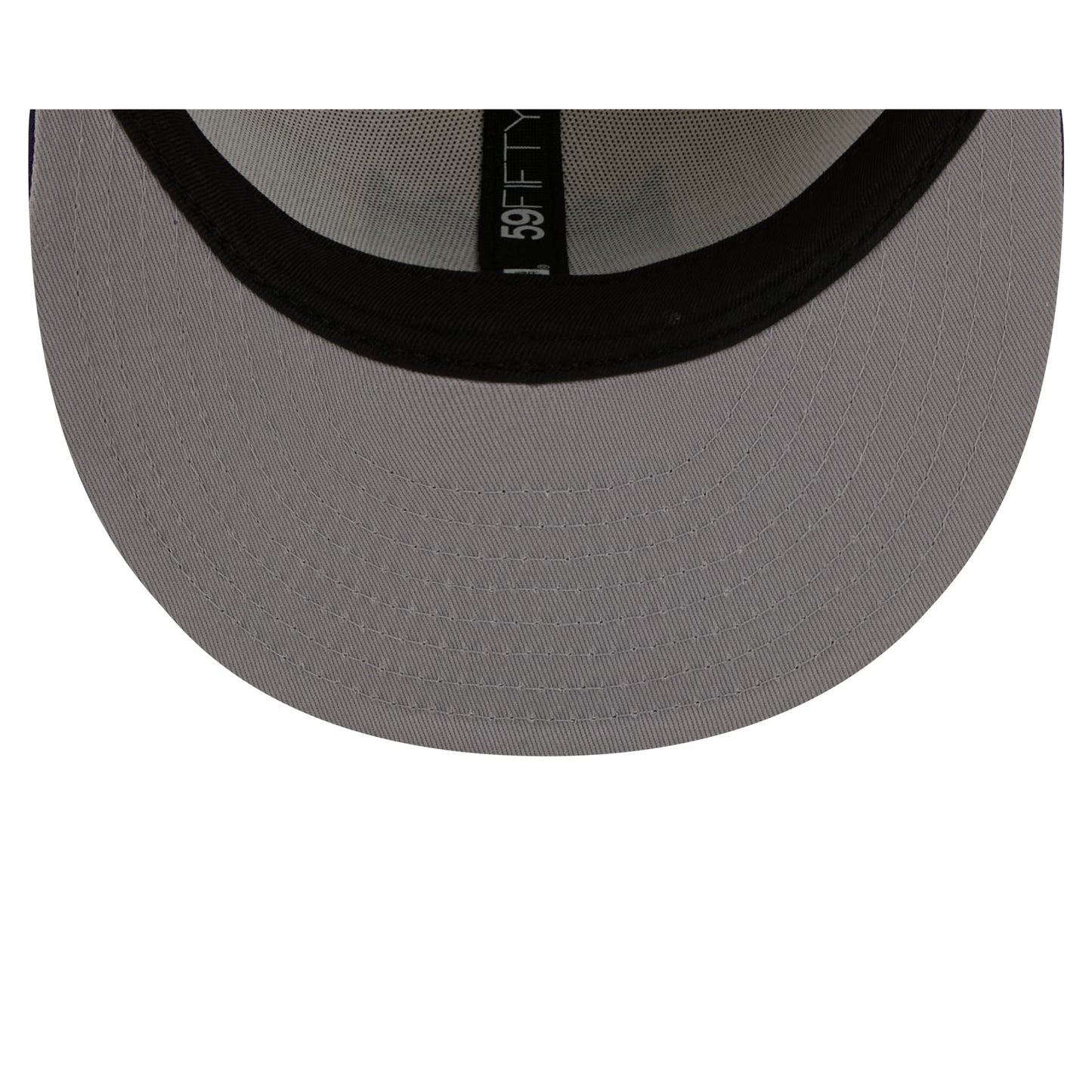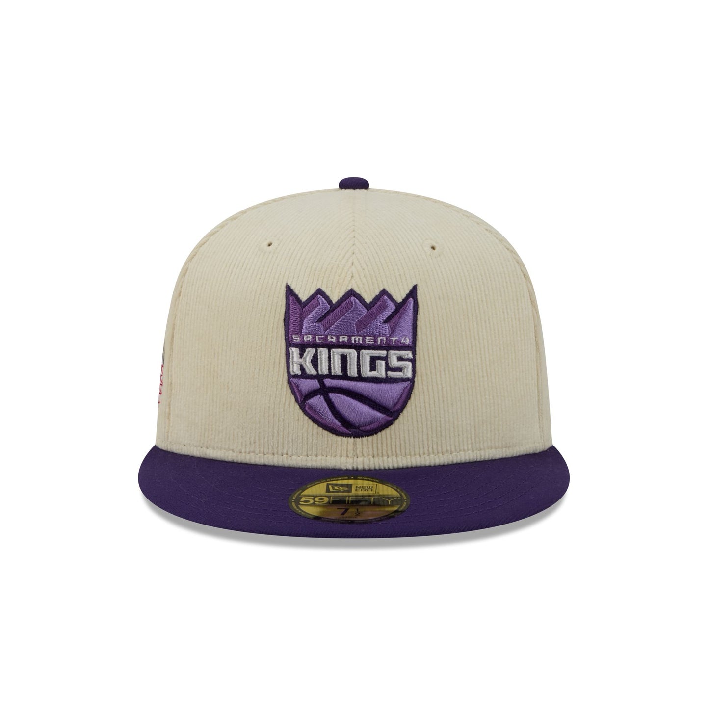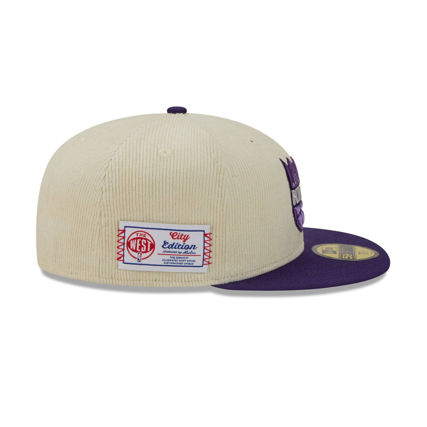 The Sacramento Kings 2025 City Edition Chrome White Corduroy 59FIFTY Fitted Cap features an embroidered Kings City Edition logo at the front panels with a City Edition jock tag stitched at the right-wear side. Additional details include a corduroy fabrication, the NBA Logoman at the rear, and a gray undervisor.