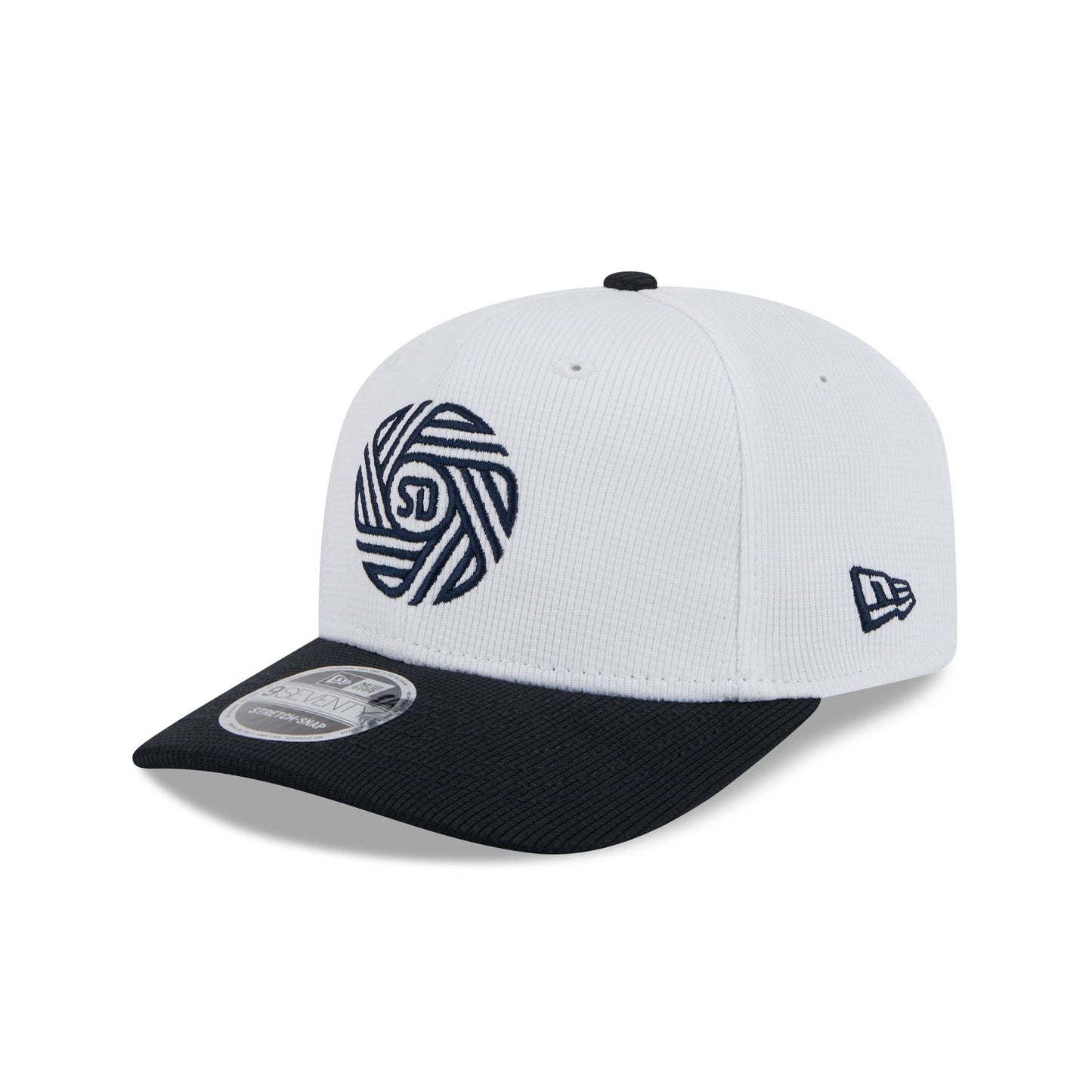 The San Diego FC 2025 Jersey Hook White 9SEVENTY Stretch-Snap features an embroidered San Diego FC logo at the front panels with a patch at the right-wear side. Additional details include a logo above a snapback closure at the rear.