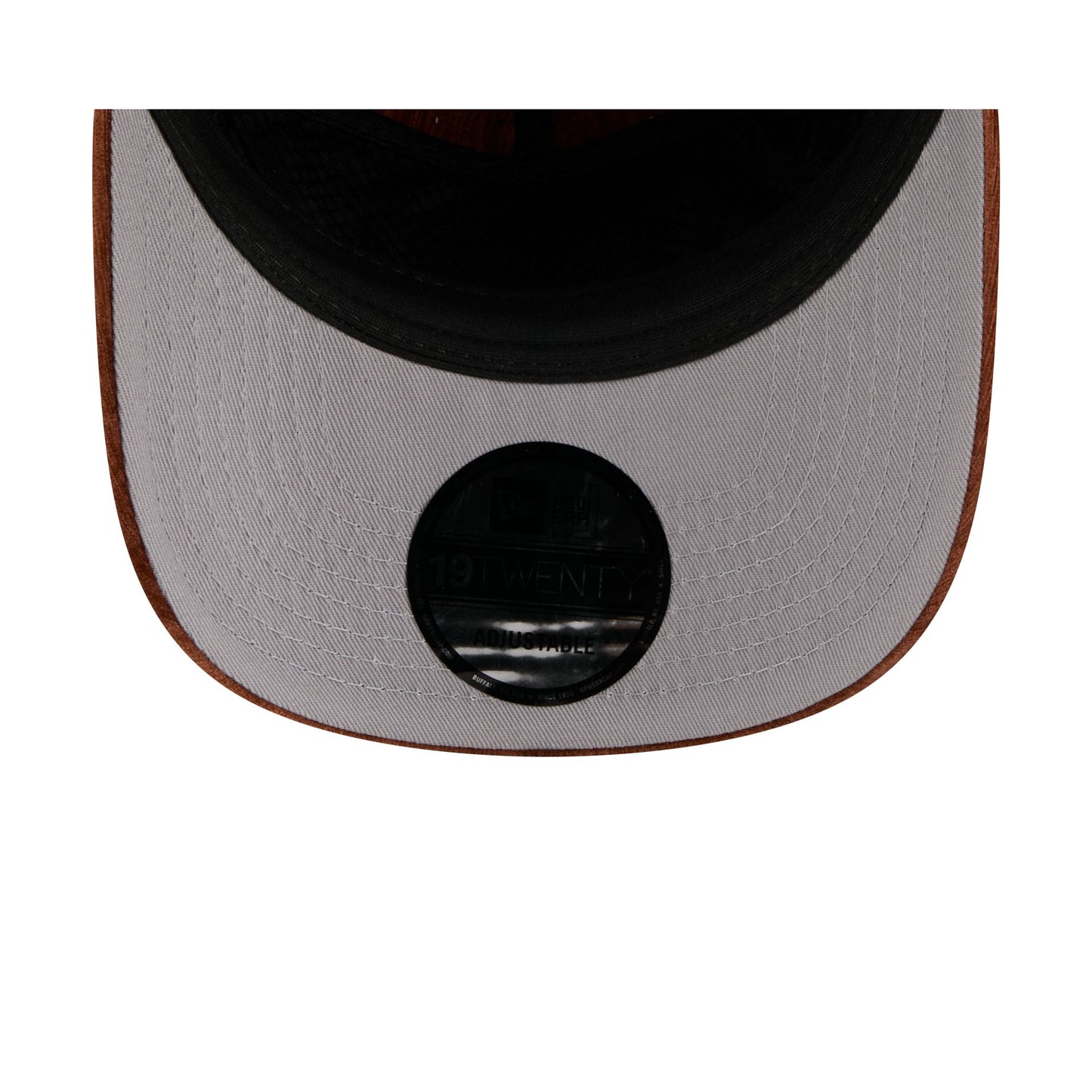 The San Diego Padres Velvet Team Script 19TWENTY Adjustable Cap features an embroidered Padres wordmark script at the front panels with a team logo at the right-wear side. Additional details include an adjustable snapback closure at the rear and a gray undervisor.