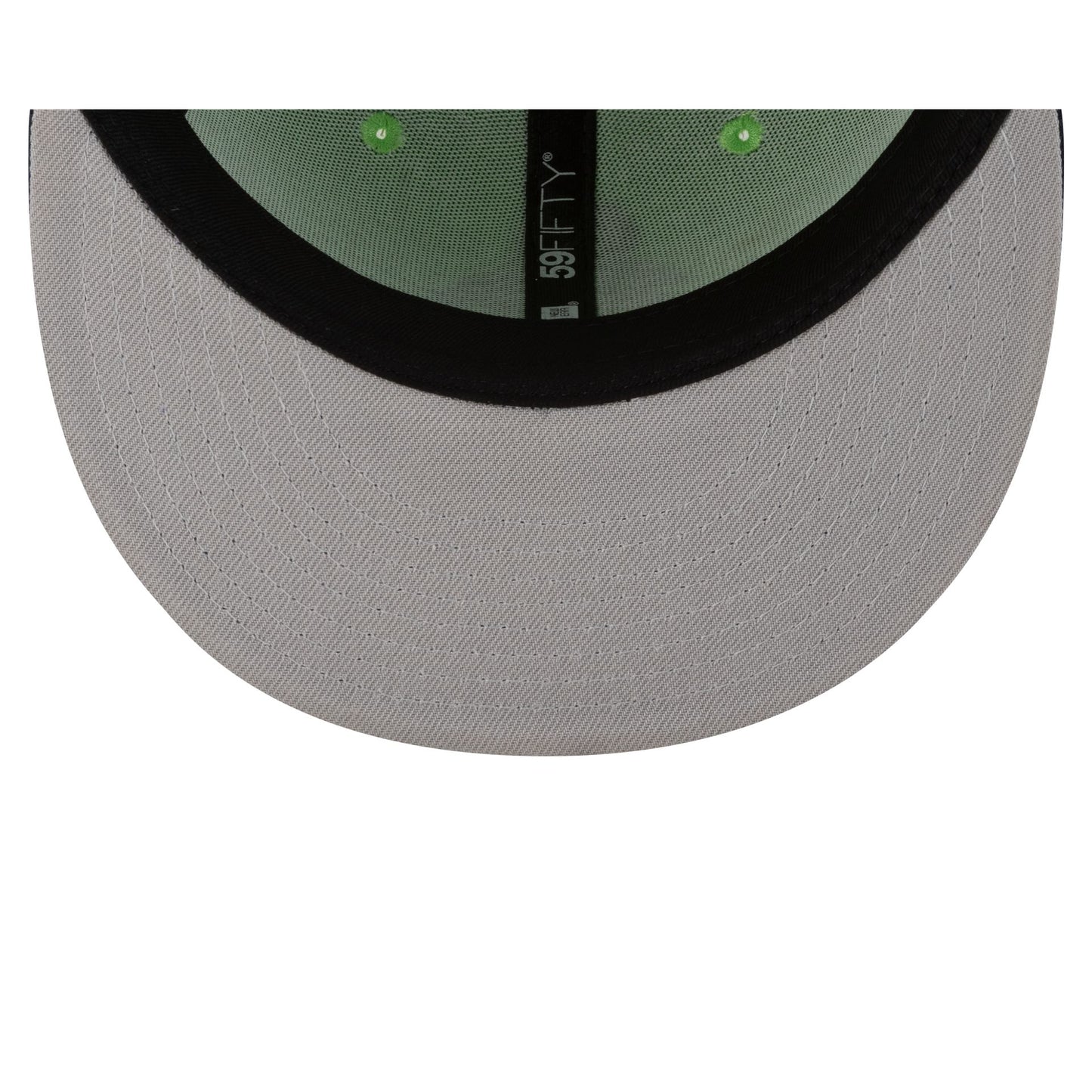 The Seattle Seahawks Mascot 59FIFTY Fitted Cap features an embroidered Seahawks mascot at the front panels with a matching NFL Shield at the rear, a 50th Anniversary team patch at the right-wear side, and a gray undervisor.