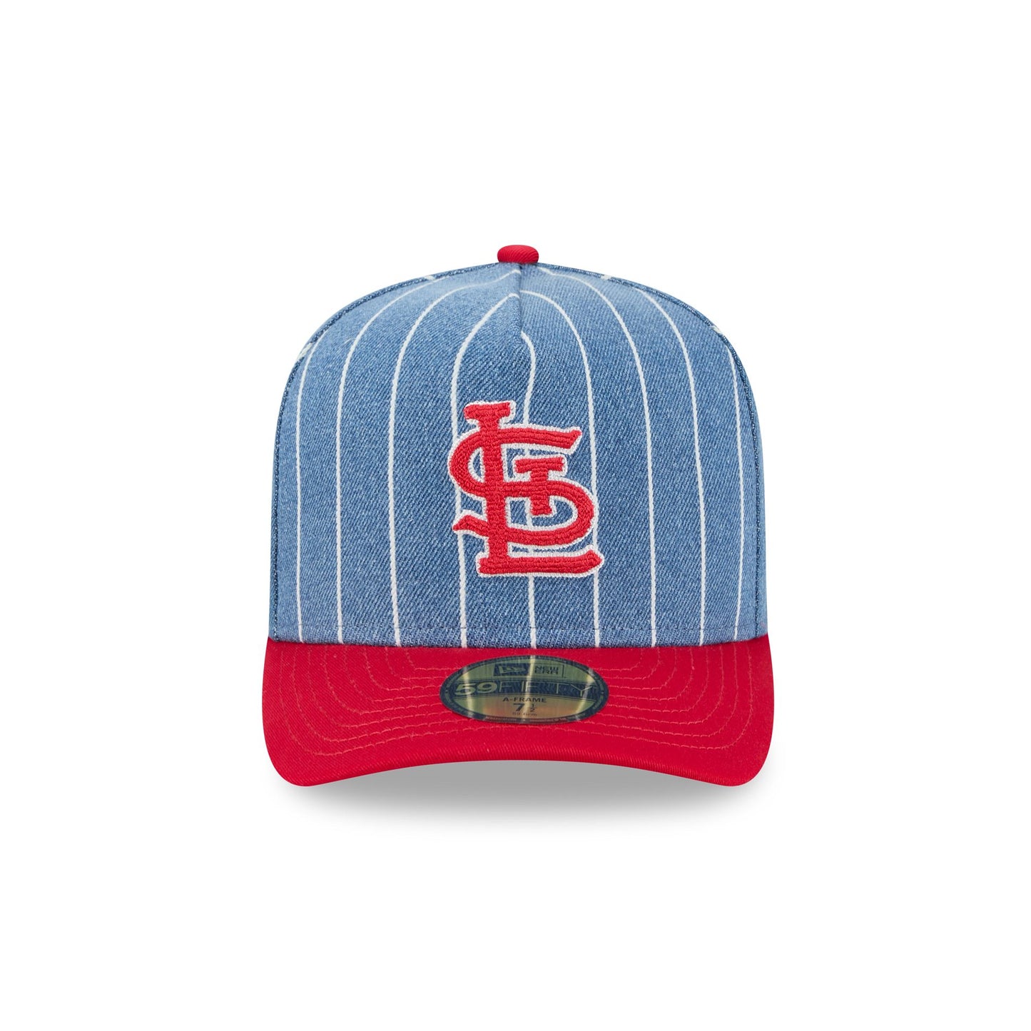 The St. Louis Cardinals Parallel 59FIFTY A-Frame Fitted Cap features an embroidered Cardinals parallel stitch logo at the front panels against a denim pinstripe fabrication throughout. Additional details include a matching MLB Batterman logo at the rear and a gray undervisor.