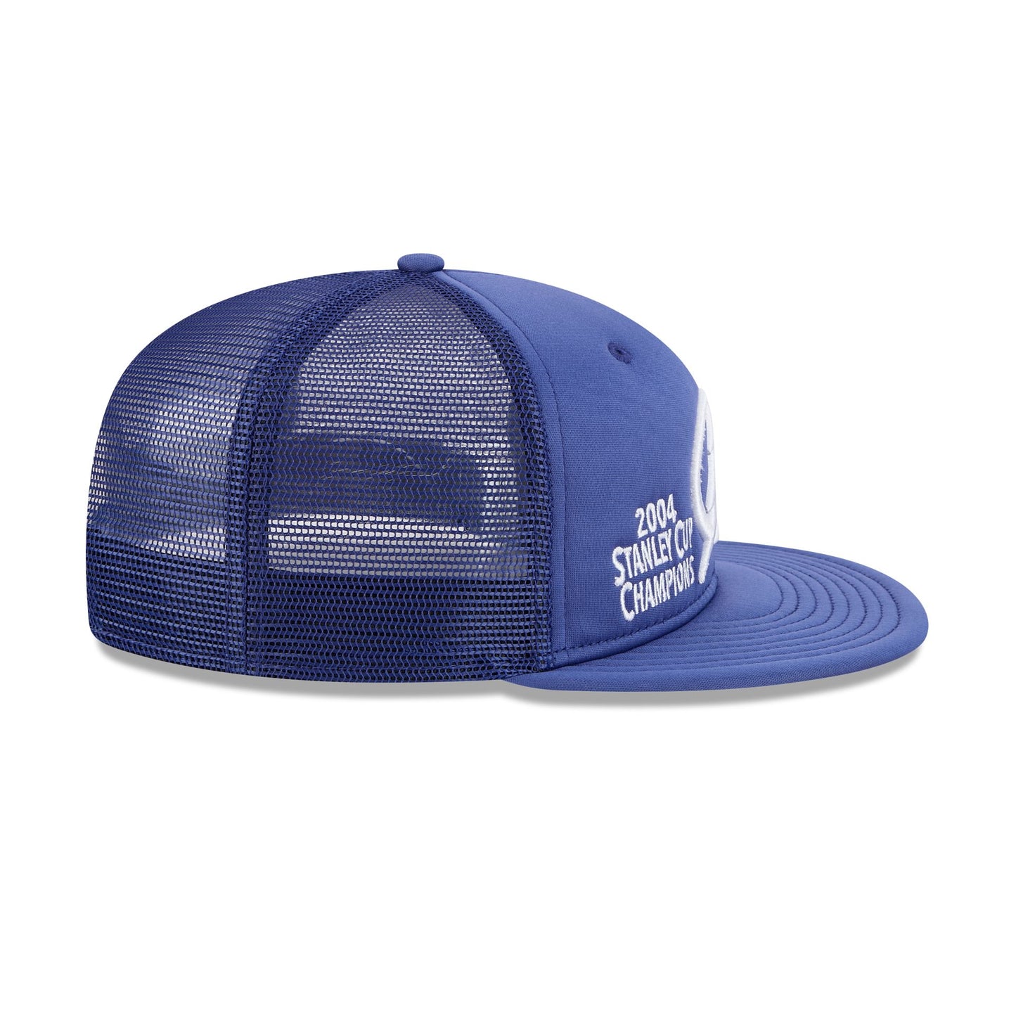 The Tampa Bay Lightning Championship Pack 9FIFTY Trucker features an embroidered Lightning logo with a 2004 Stanley Cup Champions wordmark and patch at the front panels. Additional details include a matching NHL Shield above a snapback closure at the rear with a green undervisor.