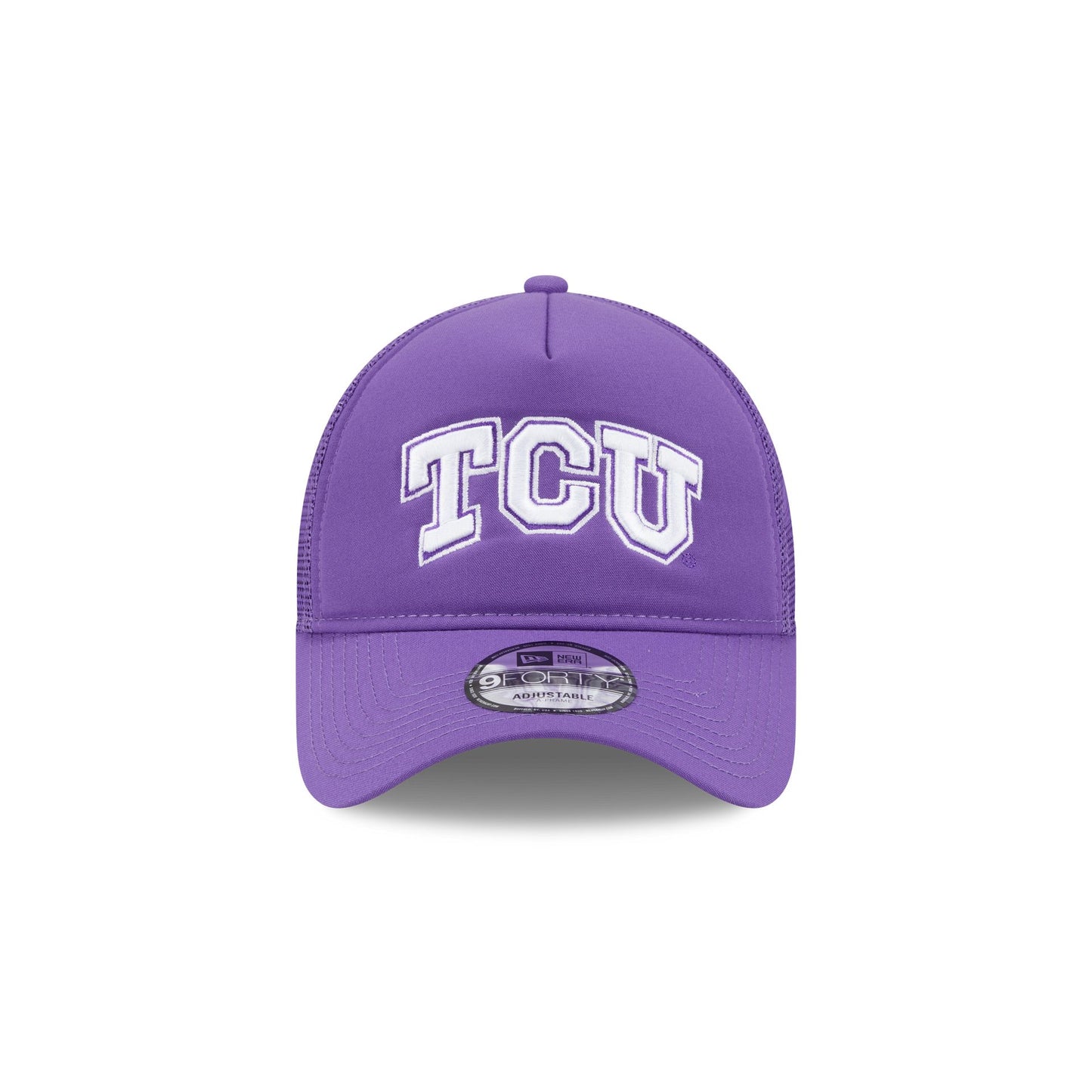The TCU Horned Frogs Go-To 9FORTY A-Frame Trucker features an embroidered Horned Frogs logo at the front panels with a snapback closure at a mesh rear.