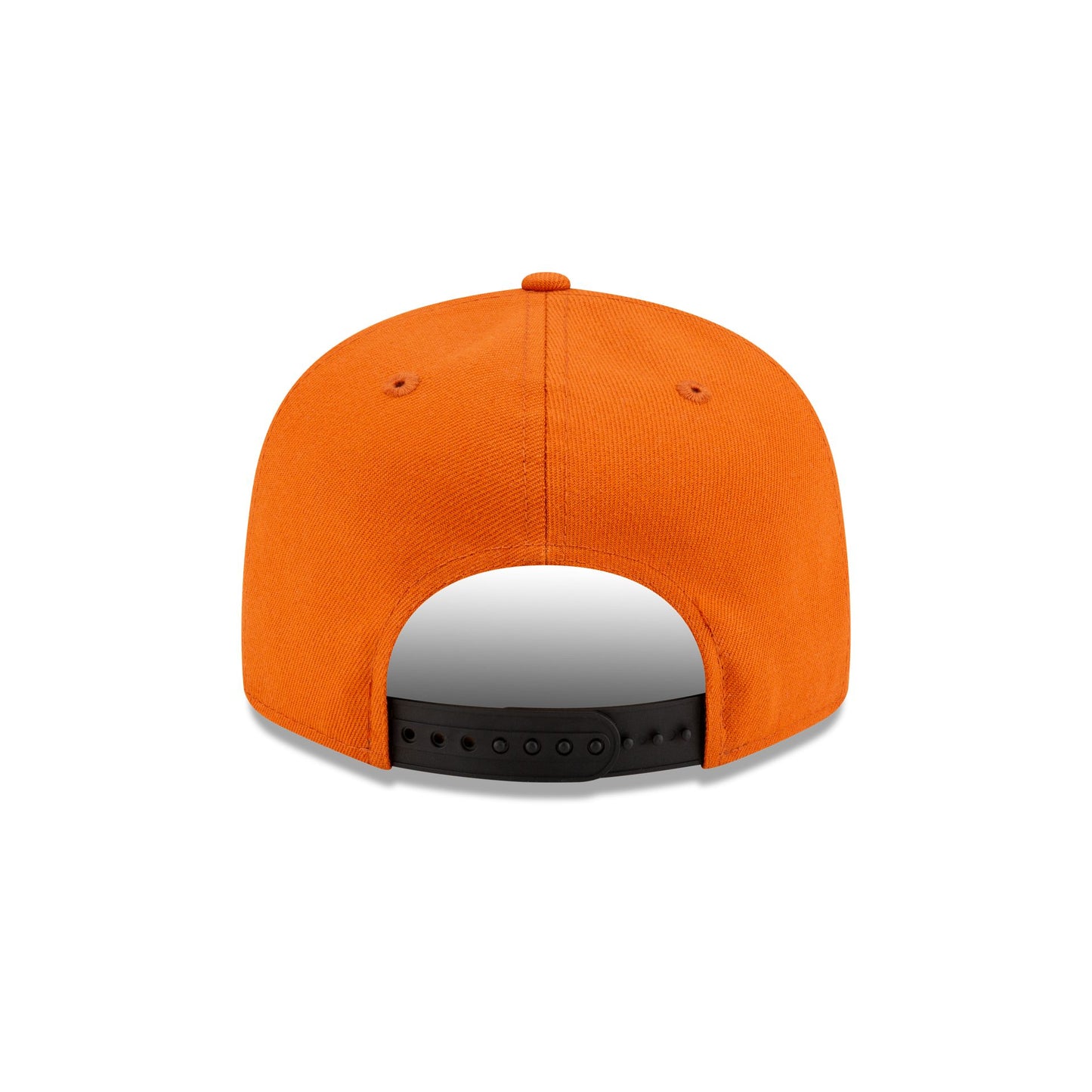 The Texas Longhorns Orange 9FIFTY Snapback features an embroidered Longhorns logo at the front panels with a snapback closure at the rear. Additional details include an alternate team logo at the right-wear side and a gray undervisor.