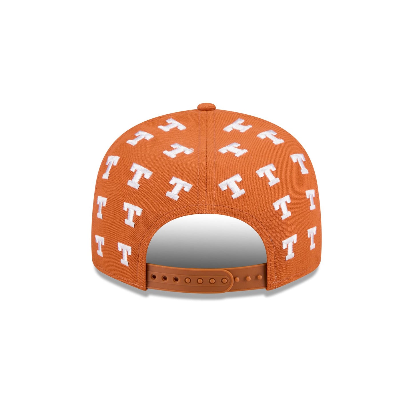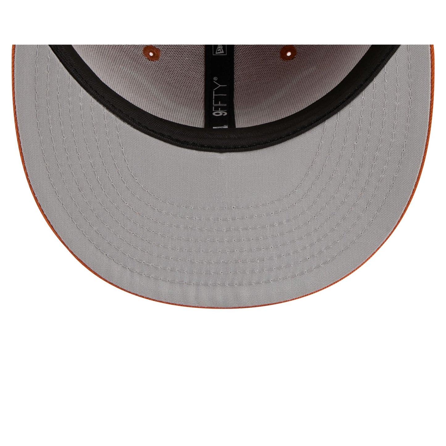 The Texas Longhorns Sticker Helmet 9FIFTY Snapback features an embroidered Longhorns logo at the front panels with embroidered team stickers the back panels. Additional details include an adjustable snapback closure at the rear and a gray undervisor.