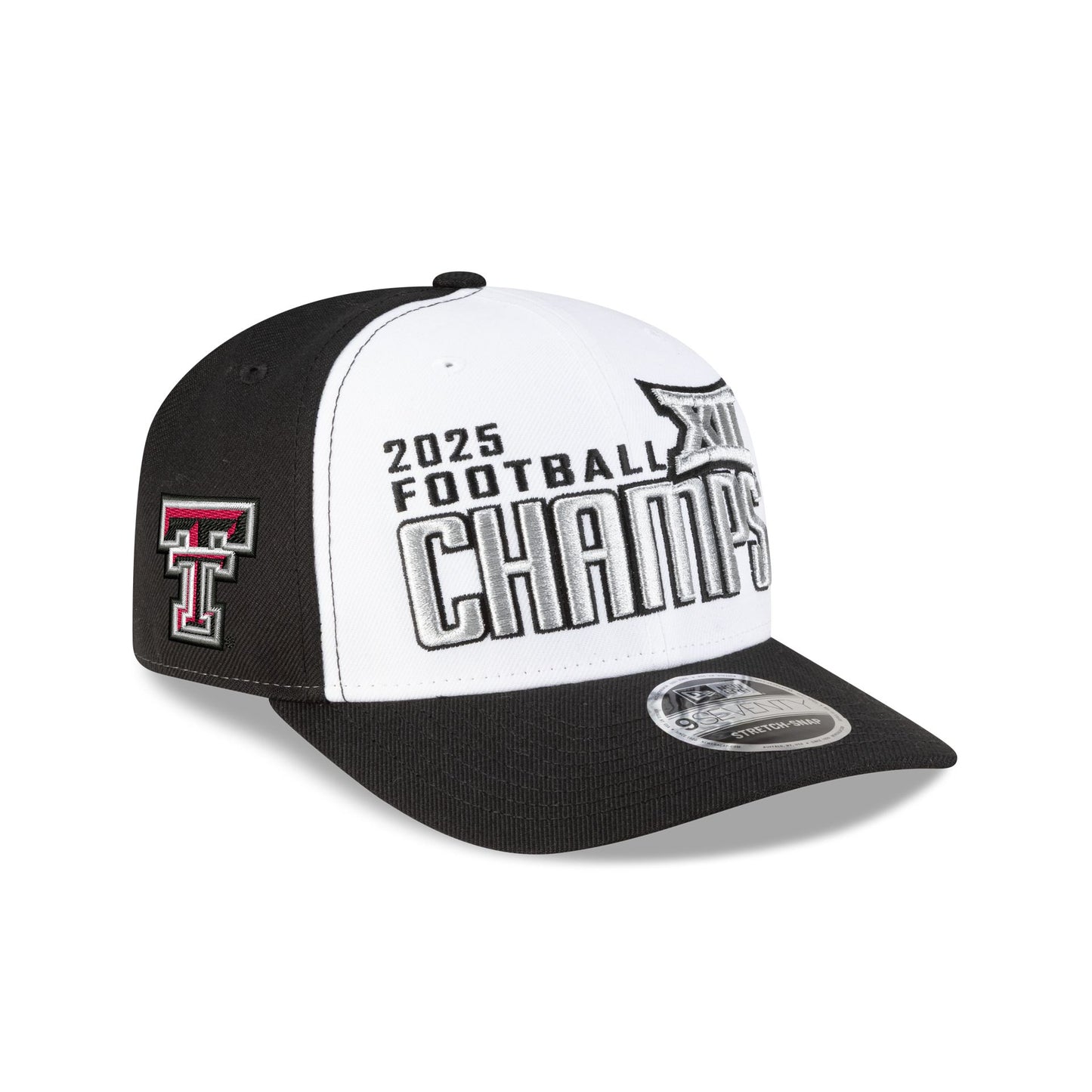 The Texas Tech Red Raiders Big 12 Football Champions 9SEVENTY Stretch-Snap features an embroidered Red Raiders 2025 Football Champions graphic at the front panels with a Red Raiders logo at the right-wear side. Additional details include an adjustable stretch-snap closure at the rear and a gray undervisor.
