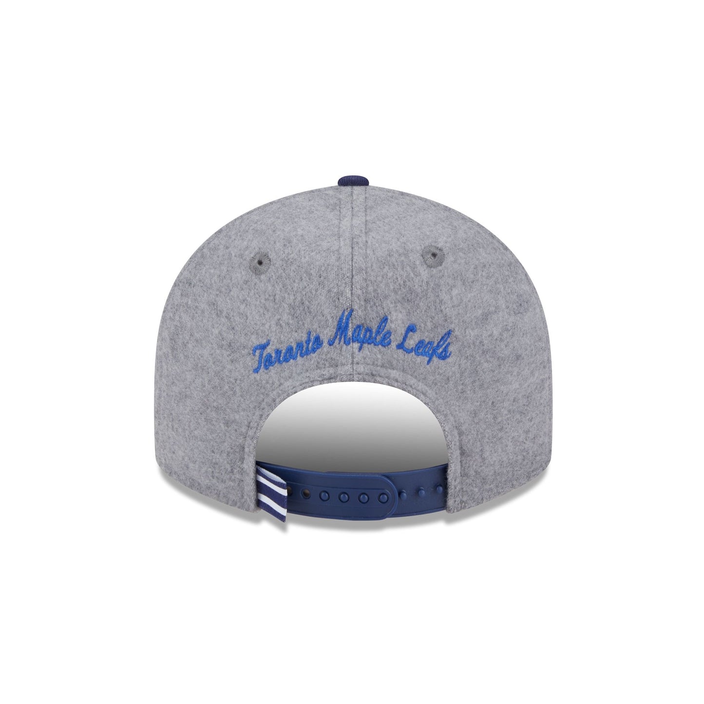 The Toronto Maple Leafs Heather Gray Wool Low Profile 9FIFTY snapback features a faux leather applique Maple Leafs logo at the front panels against a wool fabrication throughout the cap. Additional details include a conference patch at the right-wear side, an NHL pin at the front, and a script wordmark above an adjustable snapback closure at the rear.