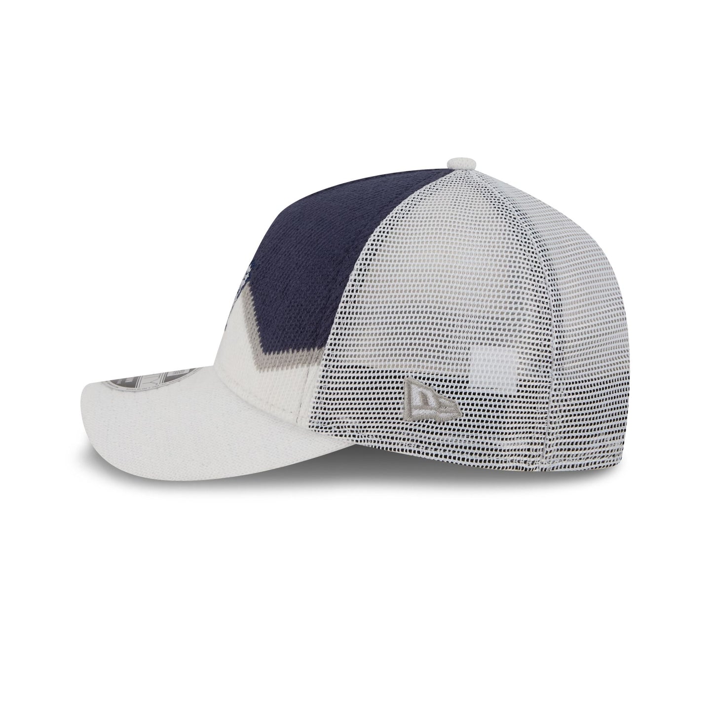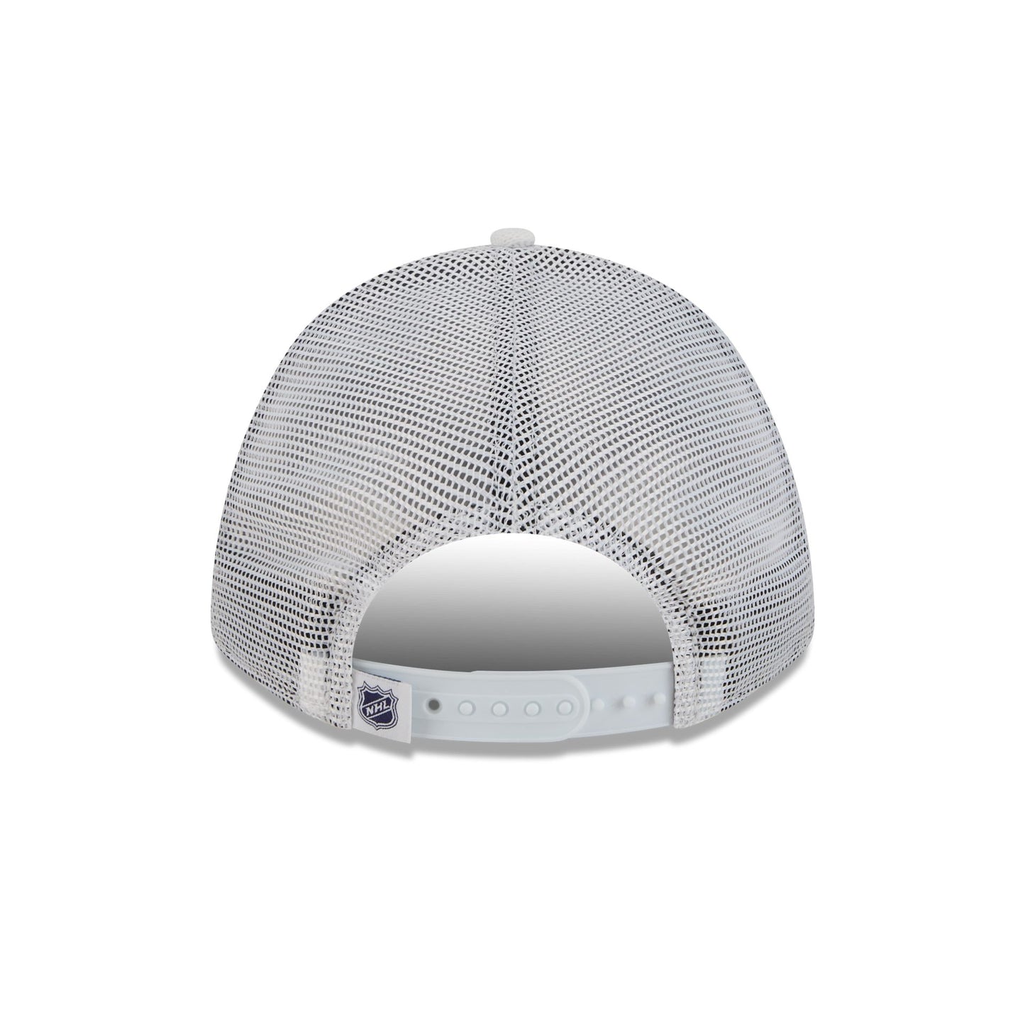 The Toronto Maple Leafs Sock 9FORTY M-Crown A-Frame Trucker features an embroidered Maple Leafs logo at the front panels against a split sock fabrication. Additional details include a snapback closure at a mesh rear.