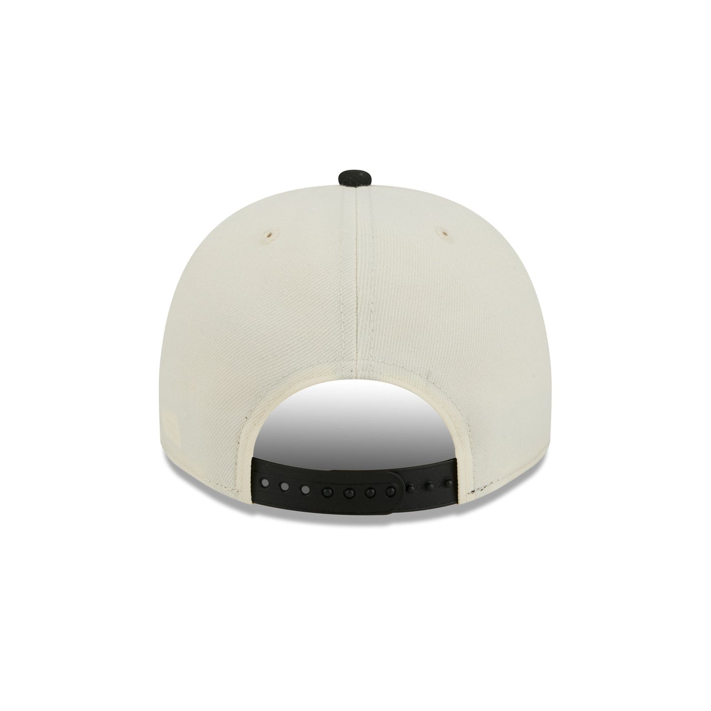 The Toronto Raptors 1995-2007 Hardwood Classics Chrome White 9FIFTY A-Frame Snapback features an embroidered vintage Raptors logo at the front panels with a team graphic to the right. Additional details include an adjustable snapback closure at the rear and a gray undervisor.