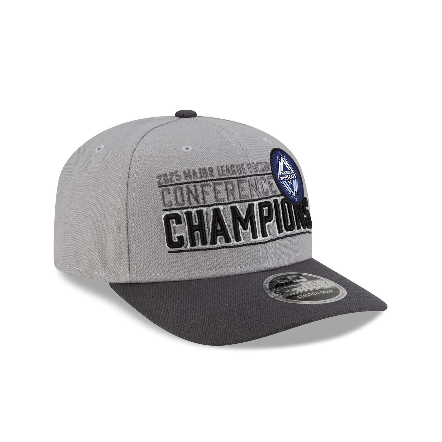 The Vancouver Whitecaps FC 2025 Conference Champions 9SEVENTY Stretch-Snap features an embroidered Whitecaps 2025 Conference Champions graphic at the front panels with the MLS Shield above an adjustable stretch-snap closure at the rear.