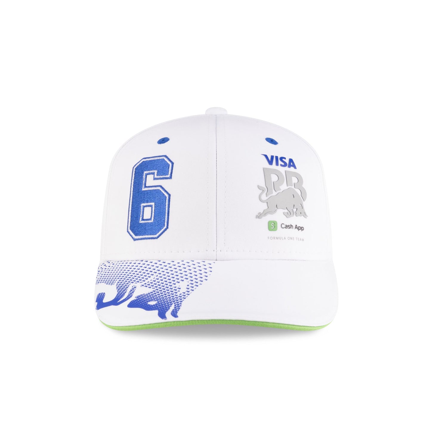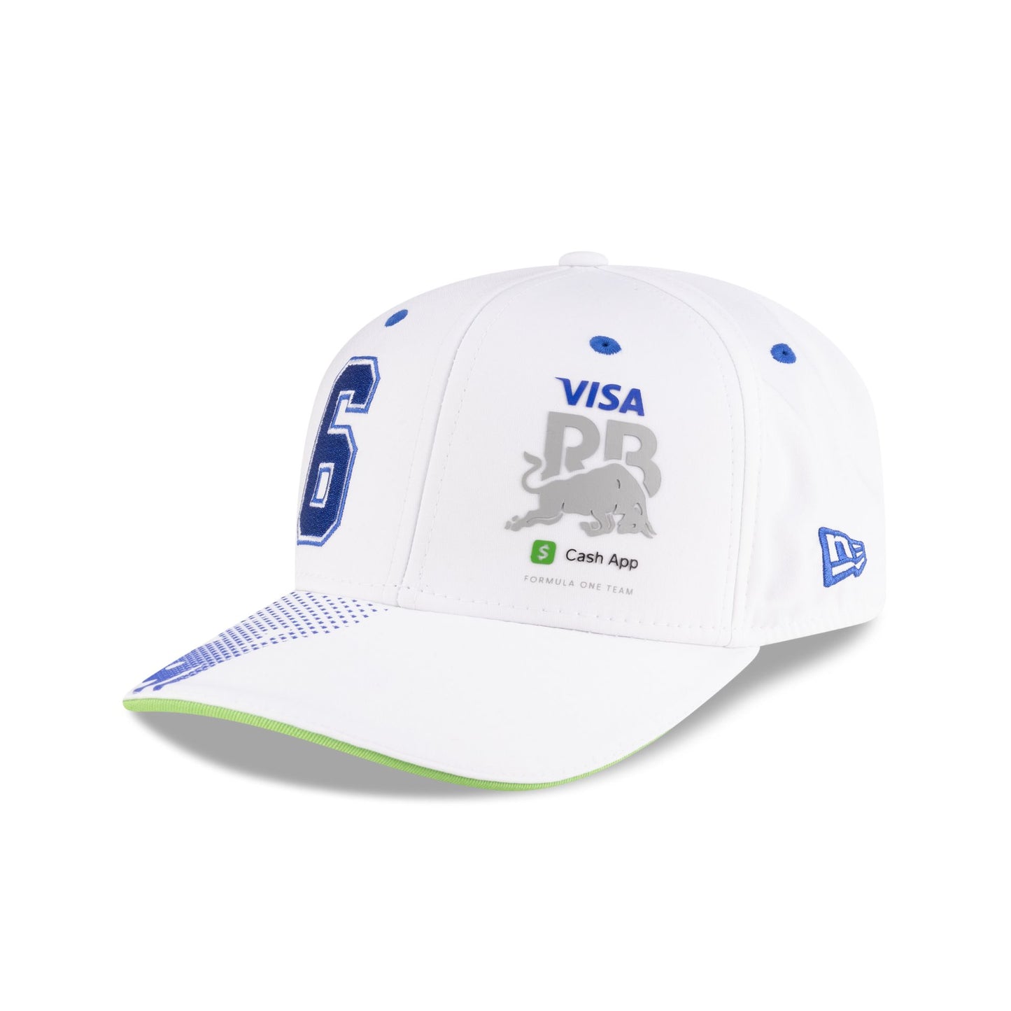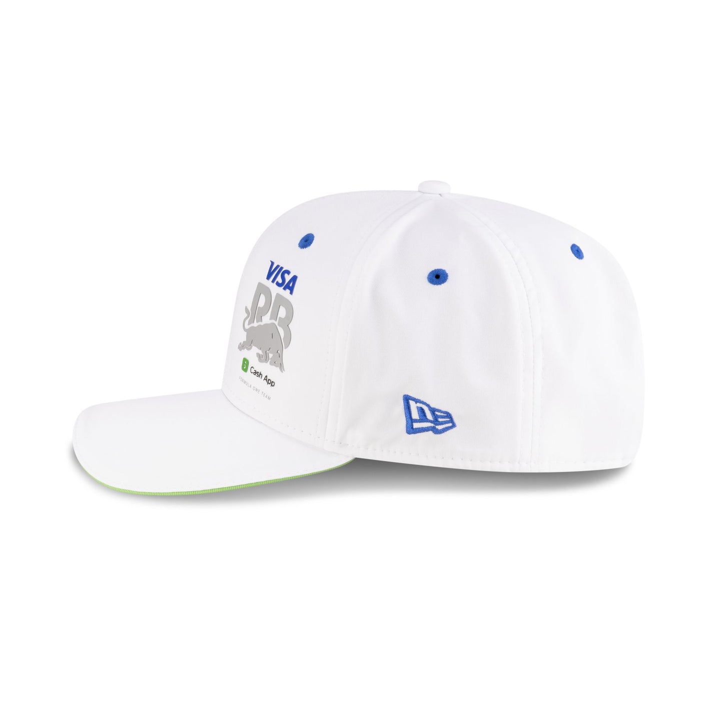 The Visa Cash App Racing Bulls Isack Hadjar 9SEVENTY Stretch-Snap Cap features a screen-printed Racing Bulls logo and embroidered driver's number at the front panels with a snapback closure at the rear. Additional details include a screen-printed Racing Bull graphic at the visor with bright green piping at the edge and a white undervisor.