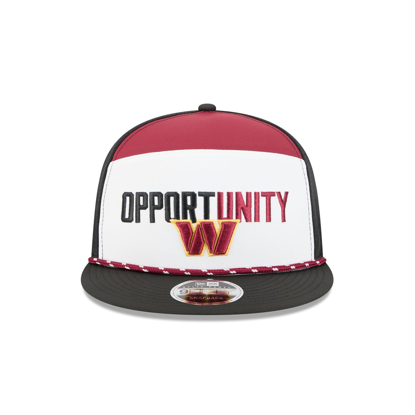 The Washington Commanders 2025 Inspire Change Split Panel 9FIFTY Snapback features an embroidered Commanders logo and matching "Opportunity" wordmark at the front panels with an NFL Inspire Change patch at the right-wear side. Additional details include a rope at the visor and an adjustable snapback closure at the rear. The cap has a split crown construction.