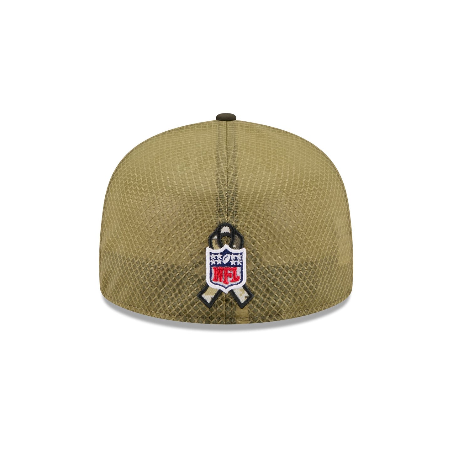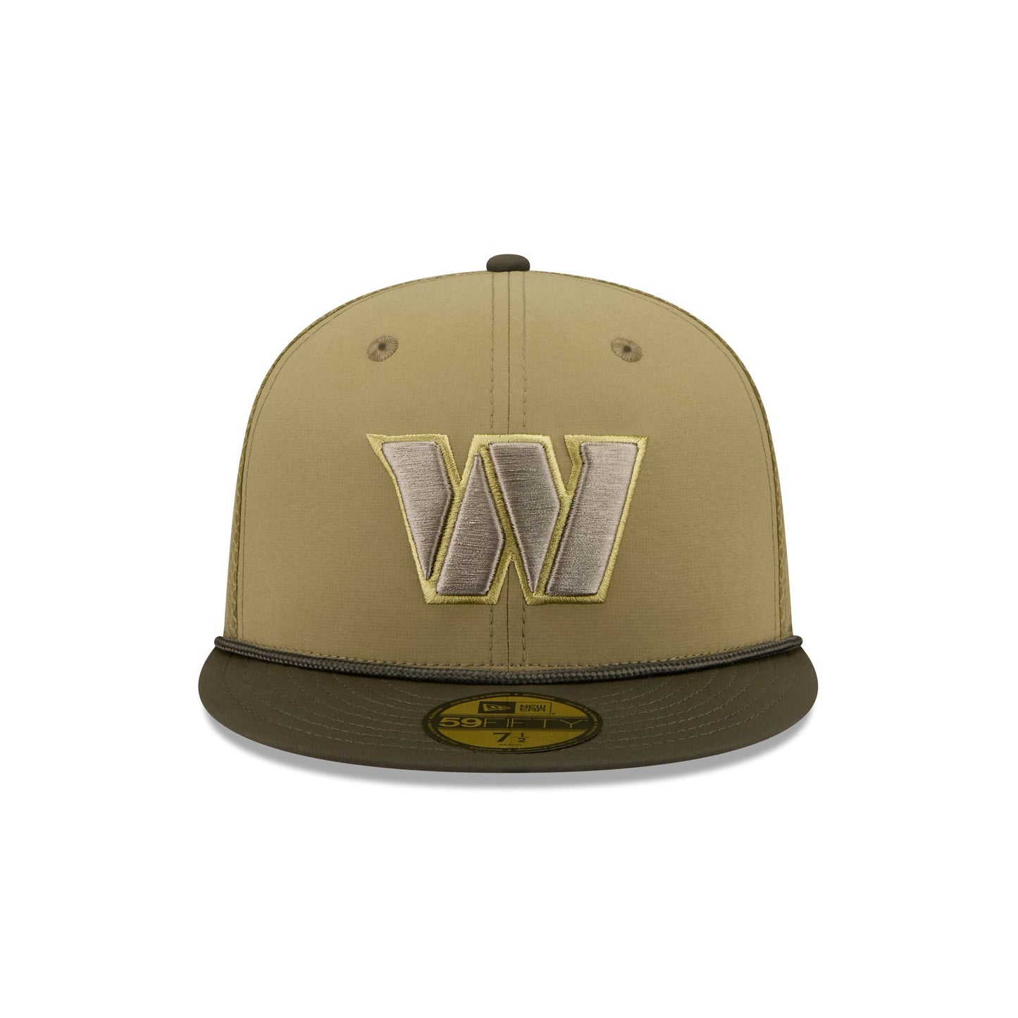 The Washington Commanders 2025 Salute to Service 59FIFTY Fitted Cap features an embroidered Commanders logo at the front panels with the official NFL Salute to Service patch at the rear mesh panels. Additional details include an American flag patch at the right-wear side with a silicone team logo patch at a dark green undervisor and a digi camo interior fabrication.