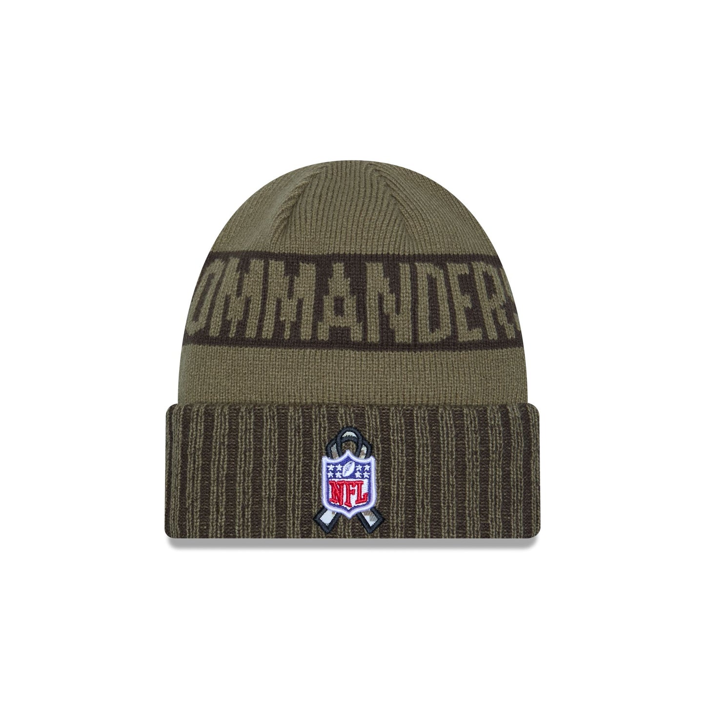 The Washington Commanders 2025 Salute to Service Cuff Knit features an embroidered Commanders logo at the front with a team wordmark at the crown, an American flag patch at the right-wear side, and the official NFL Salute to Service patch at the rear.