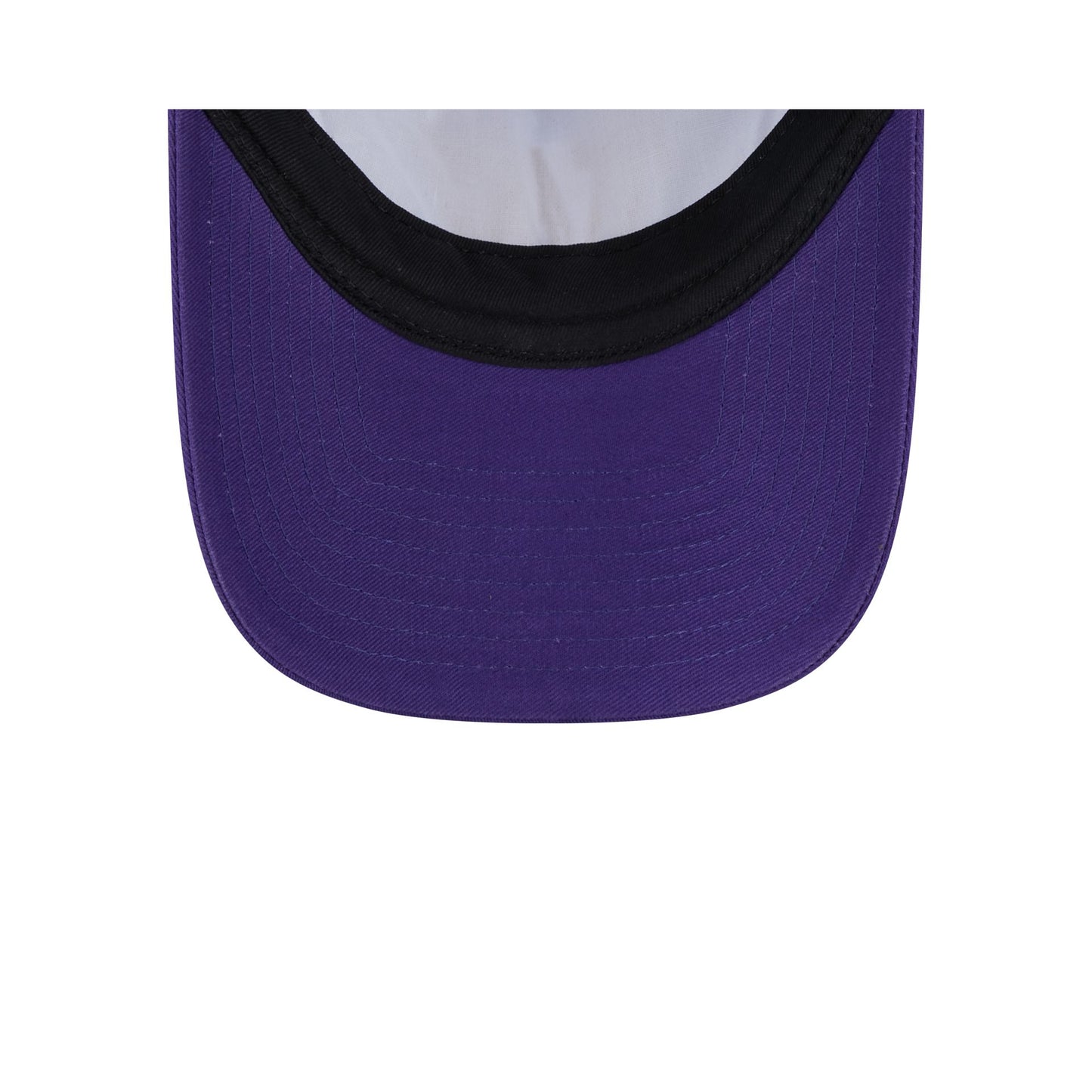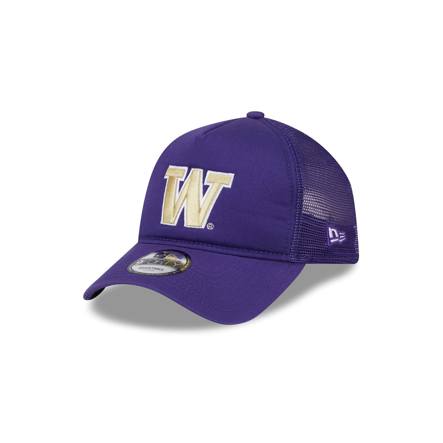 The Washington Huskies Go-To 9FORTY A-Frame Trucker features an embroidered Huskies logo at the front panels with a snapback closure at a mesh rear.