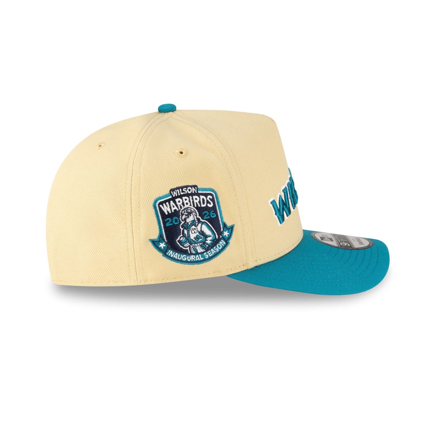 The Wilson Warbirds Vegas Gold Pre-Curved 9FIFTY A-Frame Snapback features an embroidered Warbirds wordmark at the front panel with an adjustable snapback closure at the rear. Additional details include a 2026 Inaugural Season team patch at the right-wear side with a teal pre-curved visor and a gray undervisor.