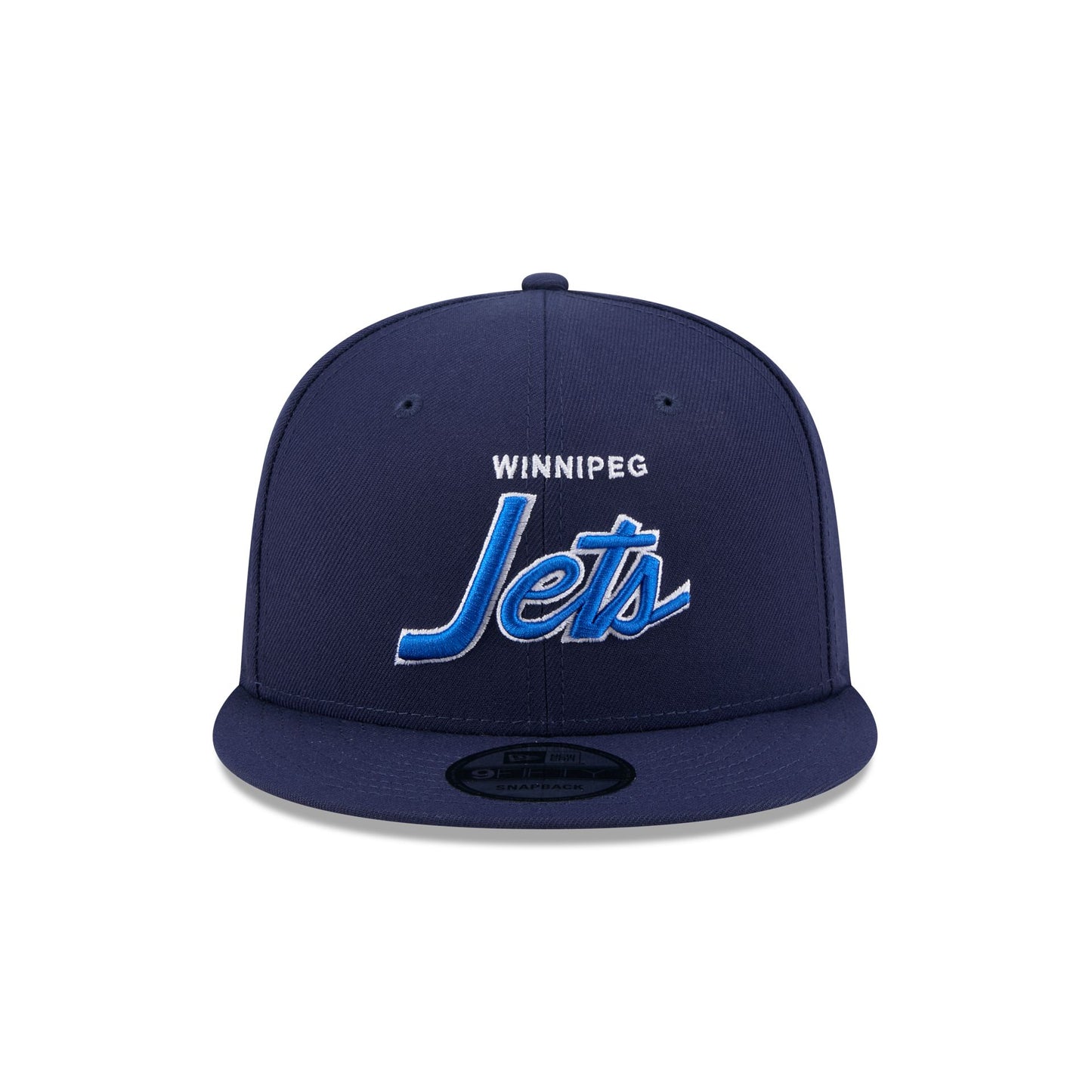 The Winnipeg Jets Script 9FIFTY Snapback features an embroidered Jets wordmark at the front panels with a team logo at the right-wear side. Additional details include a snapback closure at the rear and a gray undervisor.